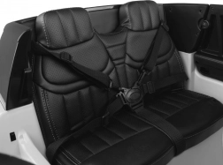Siedzenie z ekoskóry z pięciopunktowym pasem, realistyczna kierownica i przełącznik kierunku jazdy. Miękkie koła EVA dla cichej i wygodnej jazdy.