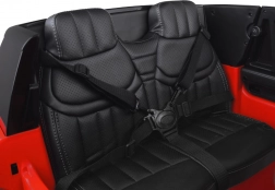 Wnętrze zachwyca tapicerowanym siedzeniem z eko‑skóry, 5‑punktowymi pasami oraz czytelną deską rozdzielczą z przełącznikiem kierunku jazdy przód/tył i przełącznikiem napędu 2x4/4x4. Kolorowy multimedialny wyświetlacz odtwarza piosenki i filmy (MP4) z USB lub karty SD, do tego Bluetooth, radio i sterowanie dotykowe.
