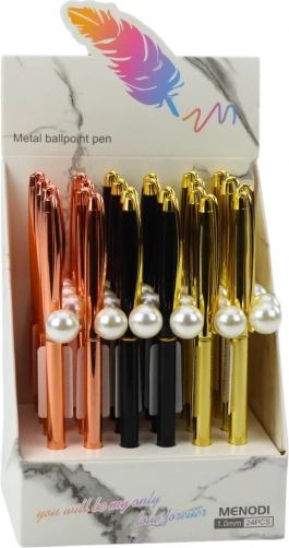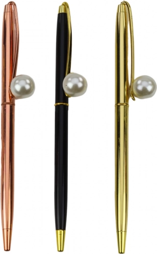 Ten stylowy długopis kulkowy zachwyca ponadczasowym designem, łączącym metalowe korpusy z wyrazistym perłowym zakończeniem. Dostępny w popularnych kolorach korpusu – złotym, czarnym i różowozłotym – stanie się eleganckim dodatkiem do codziennego pisania i wyjątkowych okazji.