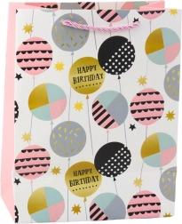 Stylowa urodzinowa torba prezentowa z wytrzymałego ozdobnego kartonu w nowoczesnym, radosnym wzornictwie. Zachwyca żywymi kolorami, napisami Happy Birthday oraz motywami balonów. Dzięki odpornemu materiałowi i sznurkowym uchwytom bezpiecznie uniesie nawet cięższe prezenty. Uniwersalny rozmiar 23 × 18 × 10,5 cm sprawdzi się na mniejsze i średniej wielkości upominki.