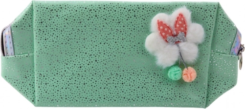 Ta uniwersalna kosmetyczka w delikatnym miętowym odcieniu łączy figlarny design z praktycznymi detalami. Błyszczące drobinki dodają eleganckiego sznytu, a przednia aplikacja w postaci puszystej chmurki z kokardką i kolorowe pompony podkreślają uroczy styl.