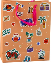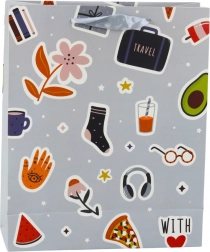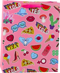 Stylowa torebka prezentowa z motywem naklejek i wyrazistymi kolorami doda każdemu prezentowi nowoczesnego i zabawnnego charakteru. Wykonana z trwałego ozdobnego kartonu i wyposażona w mocne sznurkowe uchwyty dla wygodnego noszenia. Idealna na urodziny, spotkania towarzyskie oraz prezenty dla nastolatków.