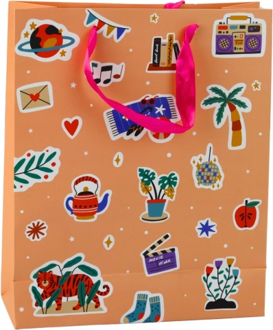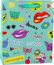 Oryginalna torebka prezentowa z nadrukiem kolorowych naklejek i modnych napisów przyciąga wzrok od pierwszego spojrzenia. Żywe kolory i trendowy design sprawiają, że to świetny dodatek do prezentów dla młodych i dorosłych. Dzięki wymiarom 32 × 26 × 12 cm bez trudu pomieści mniejsze i średniej wielkości upominki.