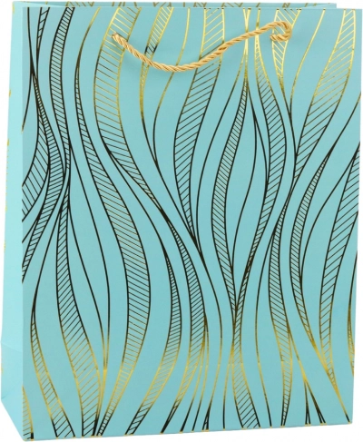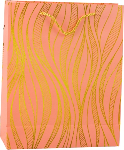 Ta stylowa torebka prezentowa wyróżnia się eleganckim złotym motywem fal na kolorowym tle oraz solidną konstrukcją, która bezproblemowo udźwignie także cięższe niespodzianki. Dopasowane kolorystycznie sznurkowe uchwyty zapewniają wygodne i bezpieczne przenoszenie.