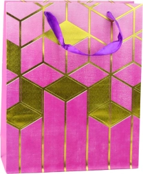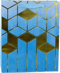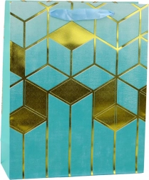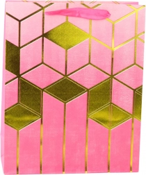 Ta elegancka torebka prezentowa łączy nowoczesny design z praktycznością. Zdobiona wyrazistymi złotymi geometrycznymi motywami i nasyconymi kolorami, stanowi reprezentacyjne opakowanie dla każdego upominku. Wytrzymały ozdobny karton i solidne sznurkowe uszy zapewniają wygodne i bezpieczne przenoszenie.