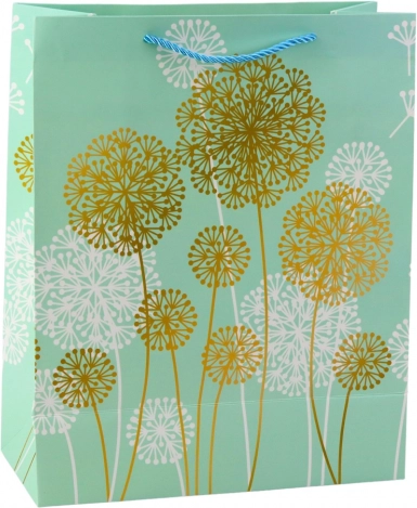 Elegancka torebka prezentowa z motywem dmuchawców i złotymi detalami to świetny wybór na każdą okazję. Wykonana z wysokiej jakości ozdobnego kartonu z mocnymi sznurkowymi uchwytami dla wygodnego noszenia. Uniwersalny rozmiar 32 × 26 × 12 cm pomieści mniejsze i większe prezenty, zapewniając stylowe i reprezentacyjne opakowanie.