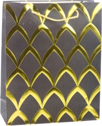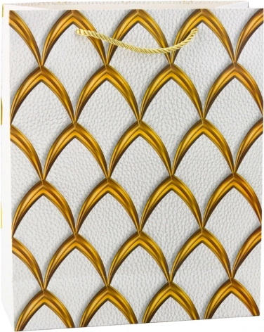 Ta stylowa torebka prezentowa nada każdemu upominkowi wyjątkowego charakteru. Błyskawicznie zapakujesz prezent, a dzięki solidnej konstrukcji i wytrzymałemu materiałowi bezpiecznie dostarczysz go obdarowanej osobie. Złote zdobienia w stylu glamour przyciągają uwagę i podnoszą prezencję upominku na wyższy poziom.