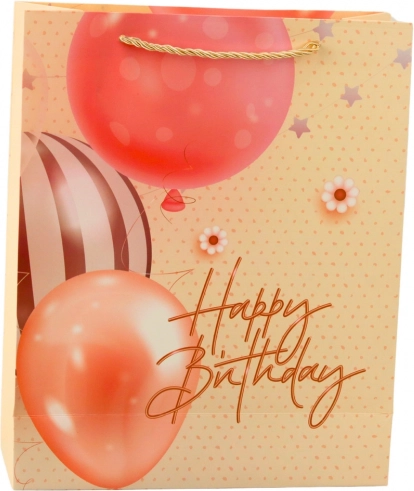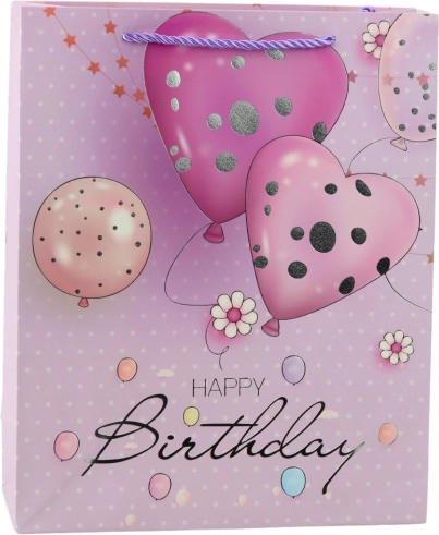 Torba prezentowa z radosnym motywem baloników i eleganckim napisem Happy Birthday to doskonały wybór na każde urodziny. Łączy atrakcyjny design w kolorach różowym, niebieskim, fioletowym i brzoskwiniowym z praktycznym wykonaniem, które bezpiecznie uniesie nawet cięższe prezenty.