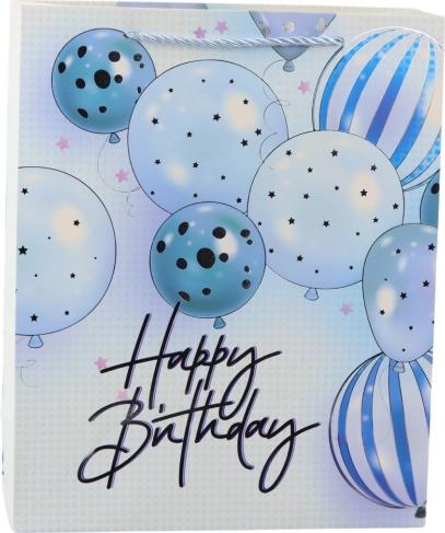Motyw baloników z napisem Happy Birthday tworzy świąteczną atmosferę i podkreśla wyjątkowość prezentu.