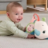 Zabawka wykorzystuje materiały z udziałem tworzyw z recyklingu i trafia w opakowaniu z certyfikatem FSC, wspierając bardziej przyjazne dla natury podejście. Dzieci pokochają boczną kieszeń do wkładania i wyjmowania drobiazgów oraz trzy przymocowane akcesoria: lusterko do samopoznania, ptasią grzechotkę dla stymulacji słuchowej i buciki, które przy ruchu przyjemnie brzęczą.