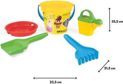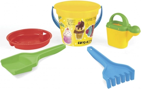 - Zestaw 5‑elementowy: łopatka, grabki, młynek do piasku i wody lub konewka, wiaderko 2 l