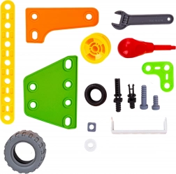 - różnie ukształtowane elementy, koła, śruby i nakrętki, śrubokręt, klucz płaski, obrazkowa instrukcja