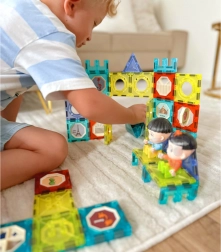 Zestaw zawiera różnorodne kształty do budowy wież, domków i zamków, 2 figurki do zabawy fabularnej, naklejki do wykończenia detali oraz instrukcję z inspiracjami. Praktyczne opakowanie z uchwytem łatwo się przenosi i jest świetnym prezentem.