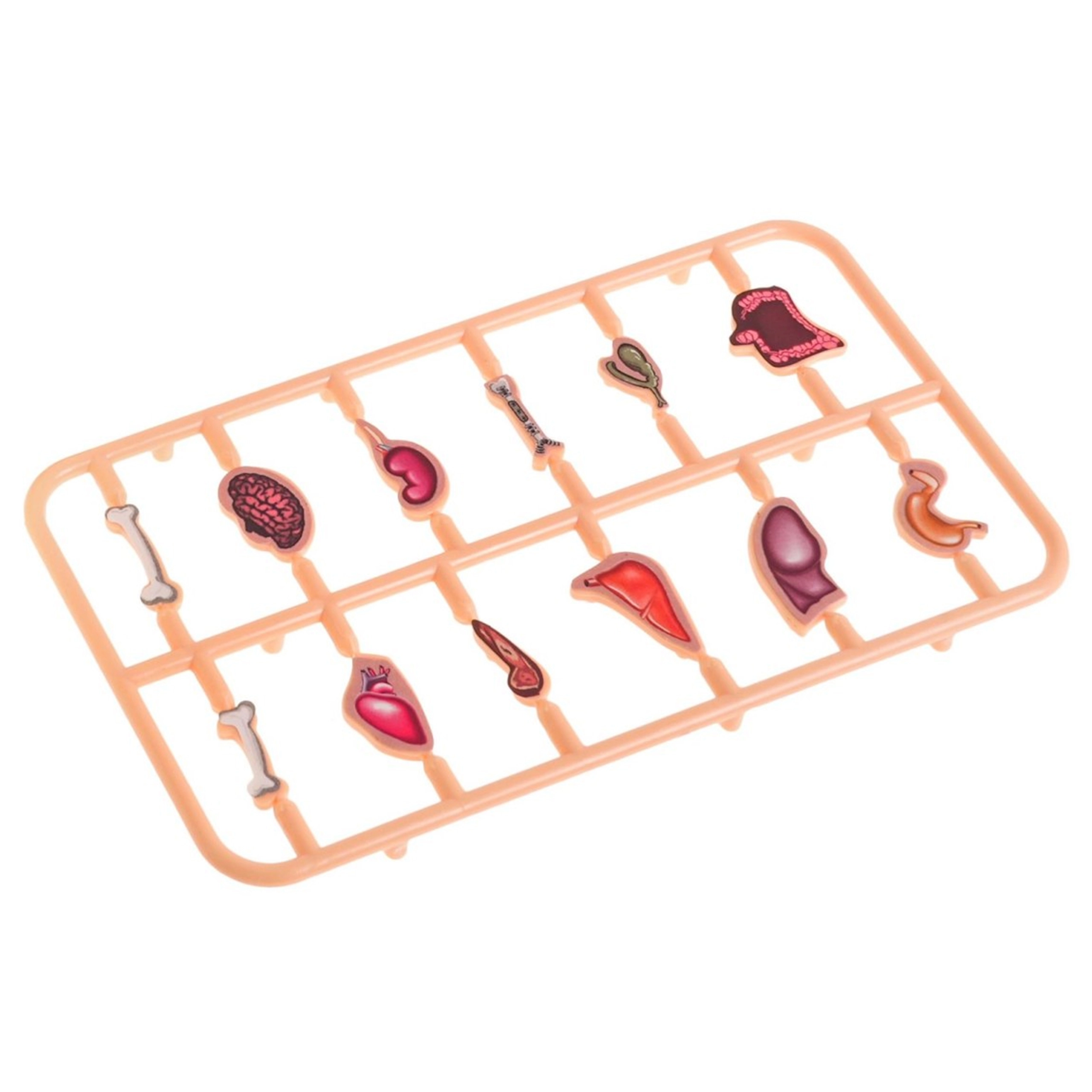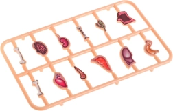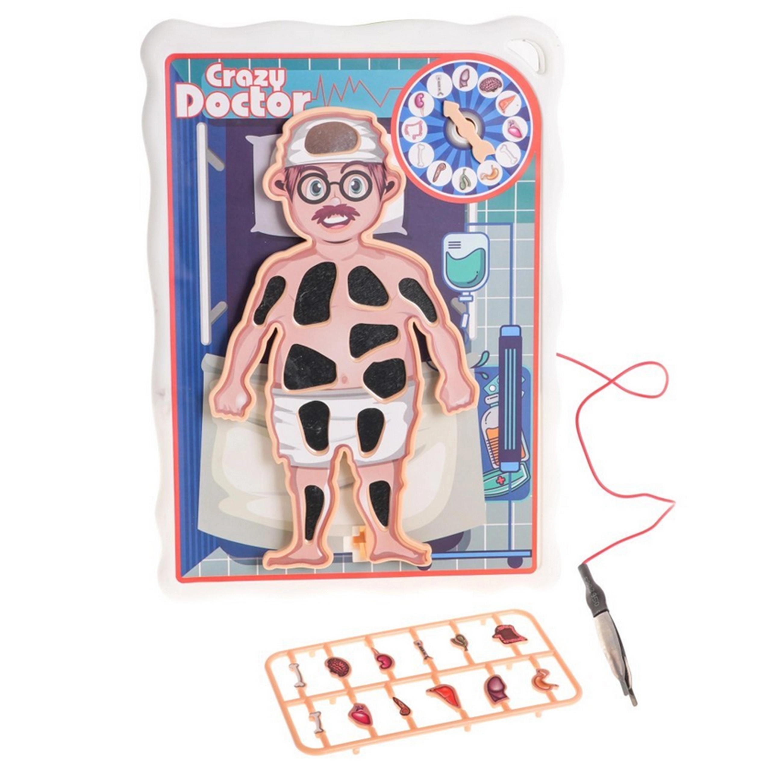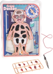 W zestawie znajduje się plansza z pacjentem, ruletka, pęseta i 12 narządów. Z tyłu umieszczono praktyczny schowek na wszystkie elementy.