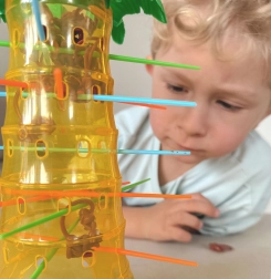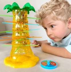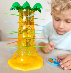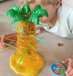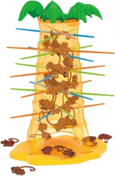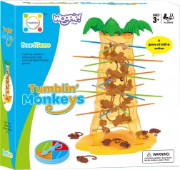 W tej niesamowitej grze marki Woopie wkładasz patyczki do otworów palmy i rzucasz na nie małpki. Każdy ruch obracasz kołem, a wskazówka określa, który patyczek musisz wyciągnąć. Celem jest, aby małpki pozostały jak najdłużej na palmie i nie pozwolić im spaść. Wygrywa ten, kto strąci najmniej małpek.