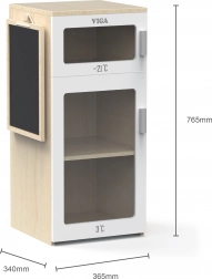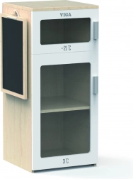 Drewniana lodówka Viga jest idealnym dodatkiem do dziecięcego kącika zabaw, który rozwija wyobraźnię i kreatywność dzieci. Lodówka ma dwie komory - zamrażarkę i lodówkę - a na drzwiach tablicę kredową do pisania list lub rysowania.