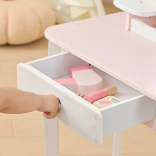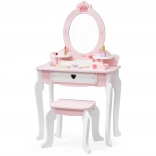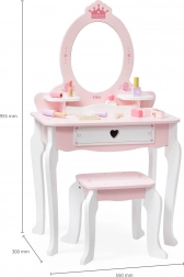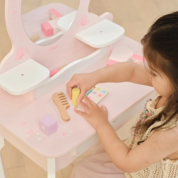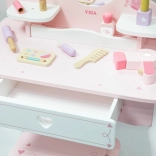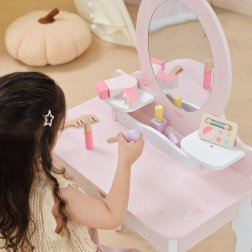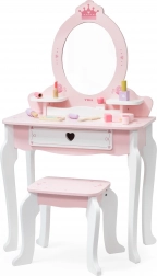 Praktyczna szuflada i boczne półeczki pomieszczą wszystkie skarby. W zestawie znajduje się bogaty komplet drewnianych akcesoriów: paletka z pędzelkiem, szminka, lakiery do paznokci, perfumy, grzebień, miękki pędzel do pudru oraz suszarka. Zabawka ma gładkie krawędzie, a powierzchnia jest pokryta nietoksycznymi farbami dla bezpiecznej zabawy.