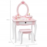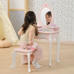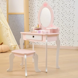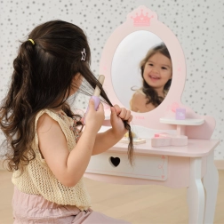 Ta różowo‑biała toaletka z wysokiej jakości drewna oferuje dzieciom bezpieczne miejsce do fantazyjnego malowania i czesania. Owalne lustro z motywem korony, urocze detale w kształcie serduszek oraz stabilny stołeczek nadają pokojowi baśniowy klimat.