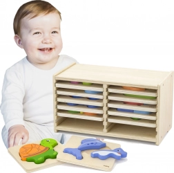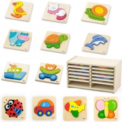 Zadaniem dziecka jest prawidłowe umieszczenie kolorowych elementów puzzli na odpowiedniej tablicy. Proste kształty, piękne ilustracje i atrakcyjne kolory przyciągają uwagę dzieci i pomagają im rozwijać umiejętności układania. W zestawie znajduje się także drewniany stojak do przechowywania tablic.