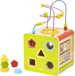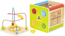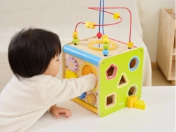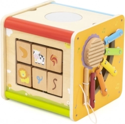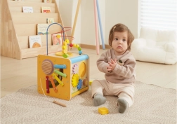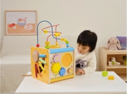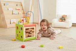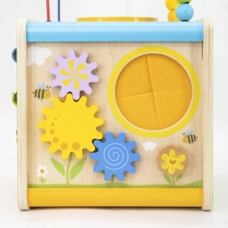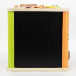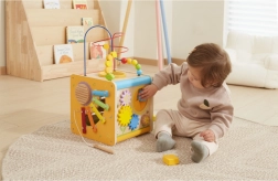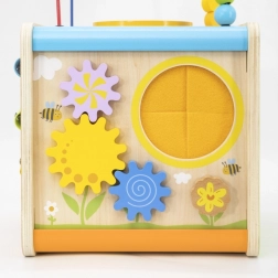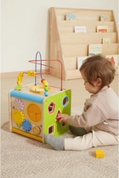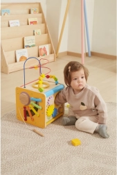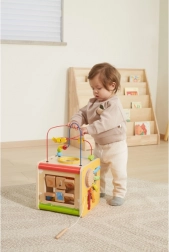 Lite drewno i gładko wykończone krawędzie gwarantują bezpieczne użytkowanie, a nasycone kolory i ciekawe mechanizmy utrzymują uwagę małych odkrywców na długi czas. Kostka świetnie nadaje się do samodzielnej zabawy i wspólnych chwil z rodzicami.