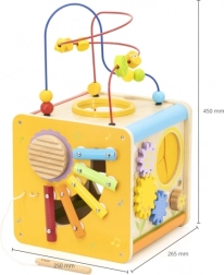 Odkryj świat kolorów, kształtów i dźwięków z tą drewnianą edukacyjną kostką 5w1. Oferuje labirynt z koralikami, sorter kształtów, kółka zębate, zegar z ruchomymi wskazówkami oraz panel muzyczny z ksylofonem. Stabilna drewniana konstrukcja, żywe kolory i przemyślane detale wspierają małą motorykę, koordynację oko–ręka, myślenie logiczne oraz kreatywność dzieci od ok. 18 miesięcy.