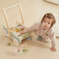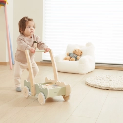 Drewniana konstrukcja zapewnia solidne wsparcie dla małych nóżek, co pozwala dziecku bezpiecznie uczyć się chodzić.