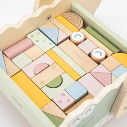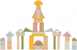 Różne kształty i pastelowe kolory klocków zachęcają do kreatywności oraz nauki kolorów i kształtów.