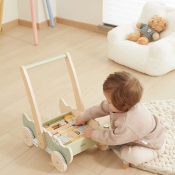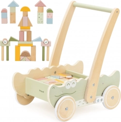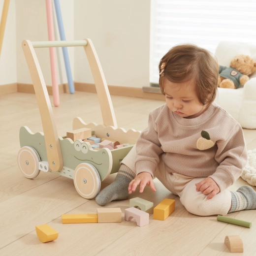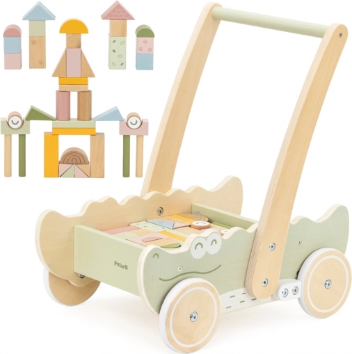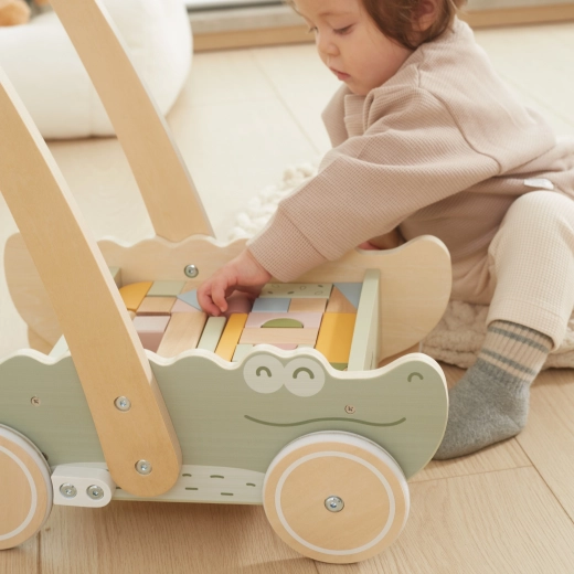 Kolorowe klocki o różnych kształtach i pastelowych barwach nie tylko zachęcają do twórczej zabawy, lecz także rozwijają małą motorykę. Miękkie gumowe kółka chronią podłogi i zapewniają płynny ruch. Ten krokodyl o uroczym wyglądzie i delikatnych kolorach stanie się ulubioną zabawką każdego dziecka!