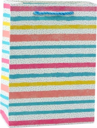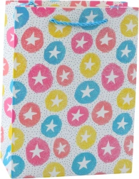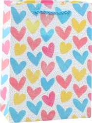 Ta torba prezentowa została wykonana z wytrzymałego ozdobnego kartonu, co zapewnia jej trwałość i estetyczny wygląd. Motywy z kolorowymi sercami, gwiazdkami, kropkami i paskami nadają torbie lekki i zabawny charakter, który świetnie pasuje do różnych rodzajów prezentów. Mocne sznurowe uchwyty w dopasowanym kolorze gwarantują wygodne przenoszenie.