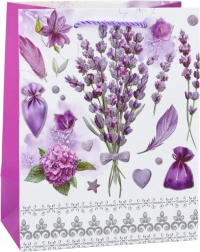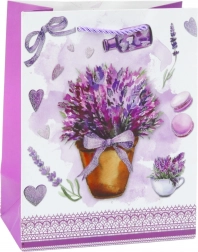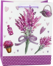 Torebka wykonana jest z wysokiej jakości kartonu dekoracyjnego, co gwarantuje jej trwałość oraz estetyczny wygląd nawet przy częstym użytkowaniu. Motyw lawendy w połączeniu z błyszczącymi akcentami i fioletowymi detalami dodaje całości uroku i elegancji. Mocne fioletowe sznurowane uchwyty zapewniają wygodne noszenie, a solidna konstrukcja umożliwia bezpieczne zapakowanie mniejszych i średnich prezentów.
