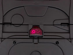 Koła EVA dla cichej pracy, siedzisko z ekoskóry z pasami oraz panel multimedialny z Bluetooth/MP3/USB, dźwiękami i klaksonem na kierownicy.