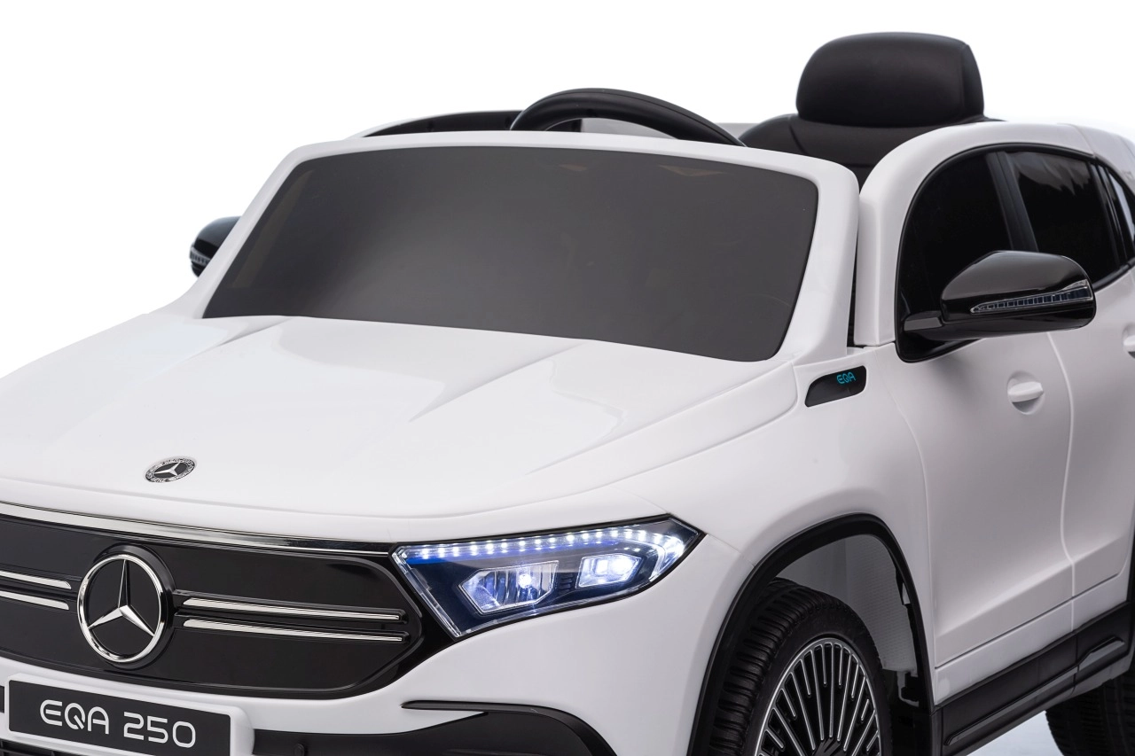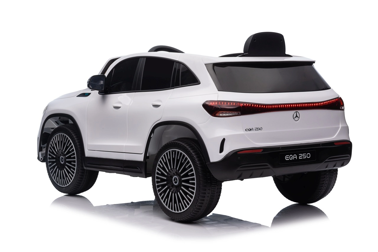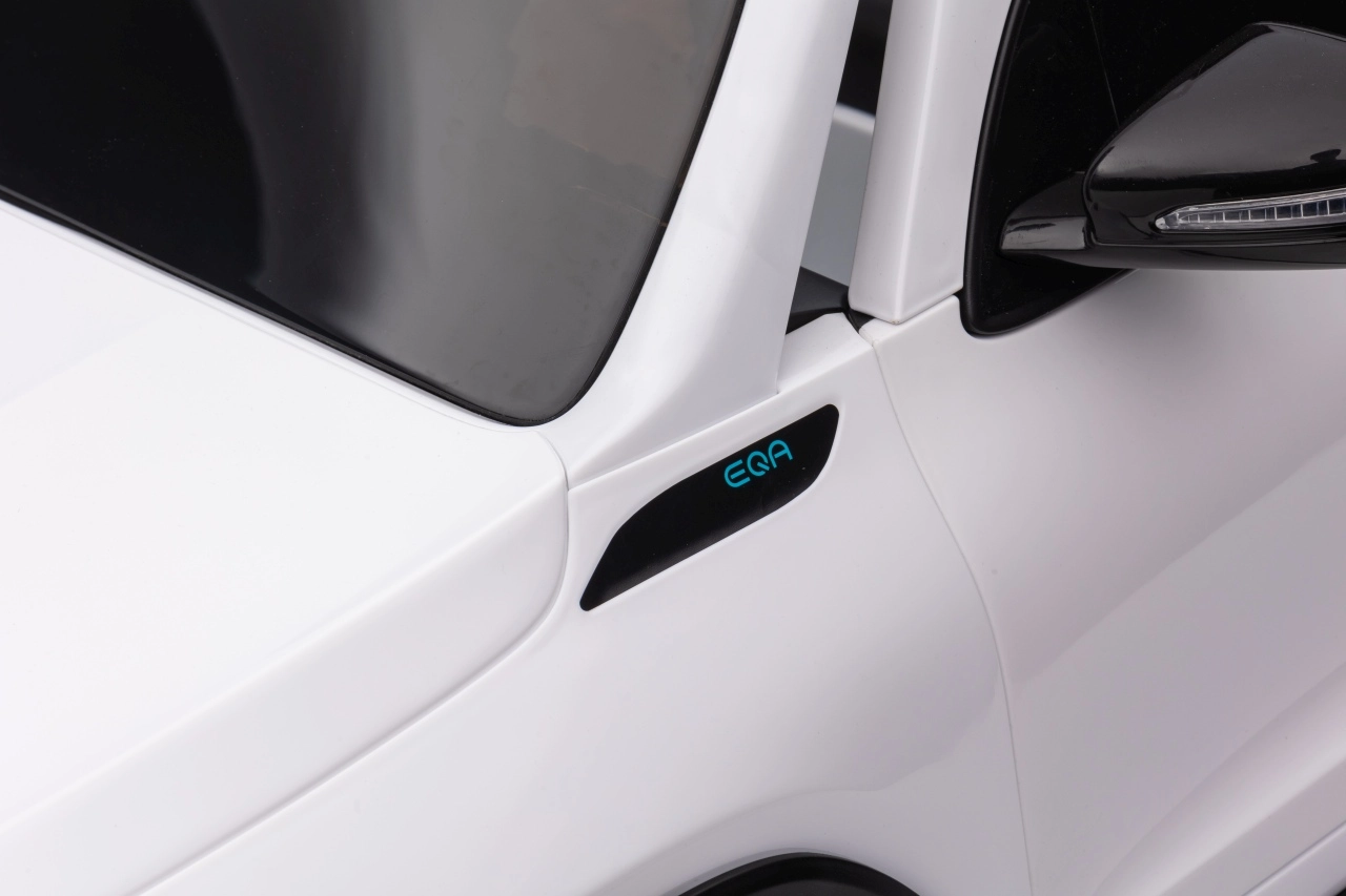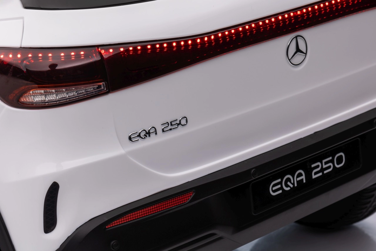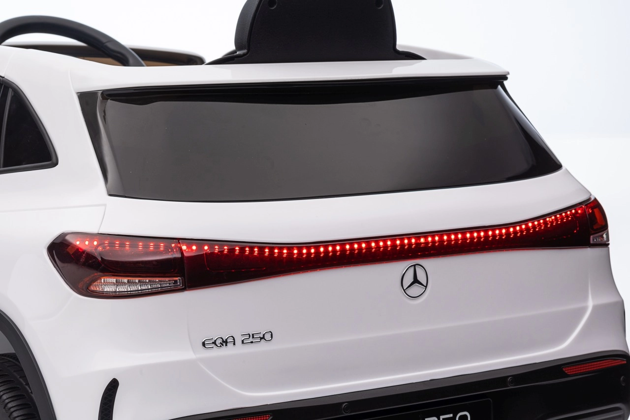 Elektryczny samochodzik MERCEDES-BENZ EQA 250 w białym kolorze łączy premium design z praktycznymi funkcjami. Dzięki czterem silnikom 35 W zapewnia płynną jazdę, a miękkie koła EVA i tylne amortyzatory zwiększają komfort na nierównościach. Płynny start bez szarpania oraz wybór 2 prędkości do przodu/tyłu ułatwiają prowadzenie młodszym kierowcom.
