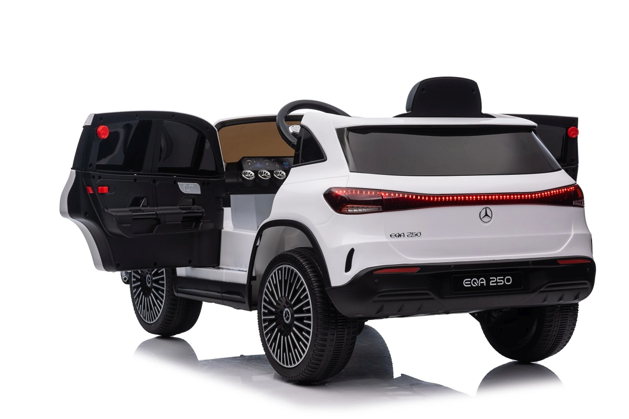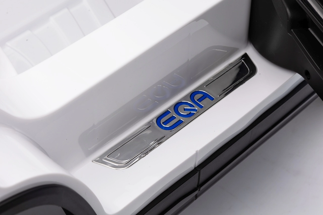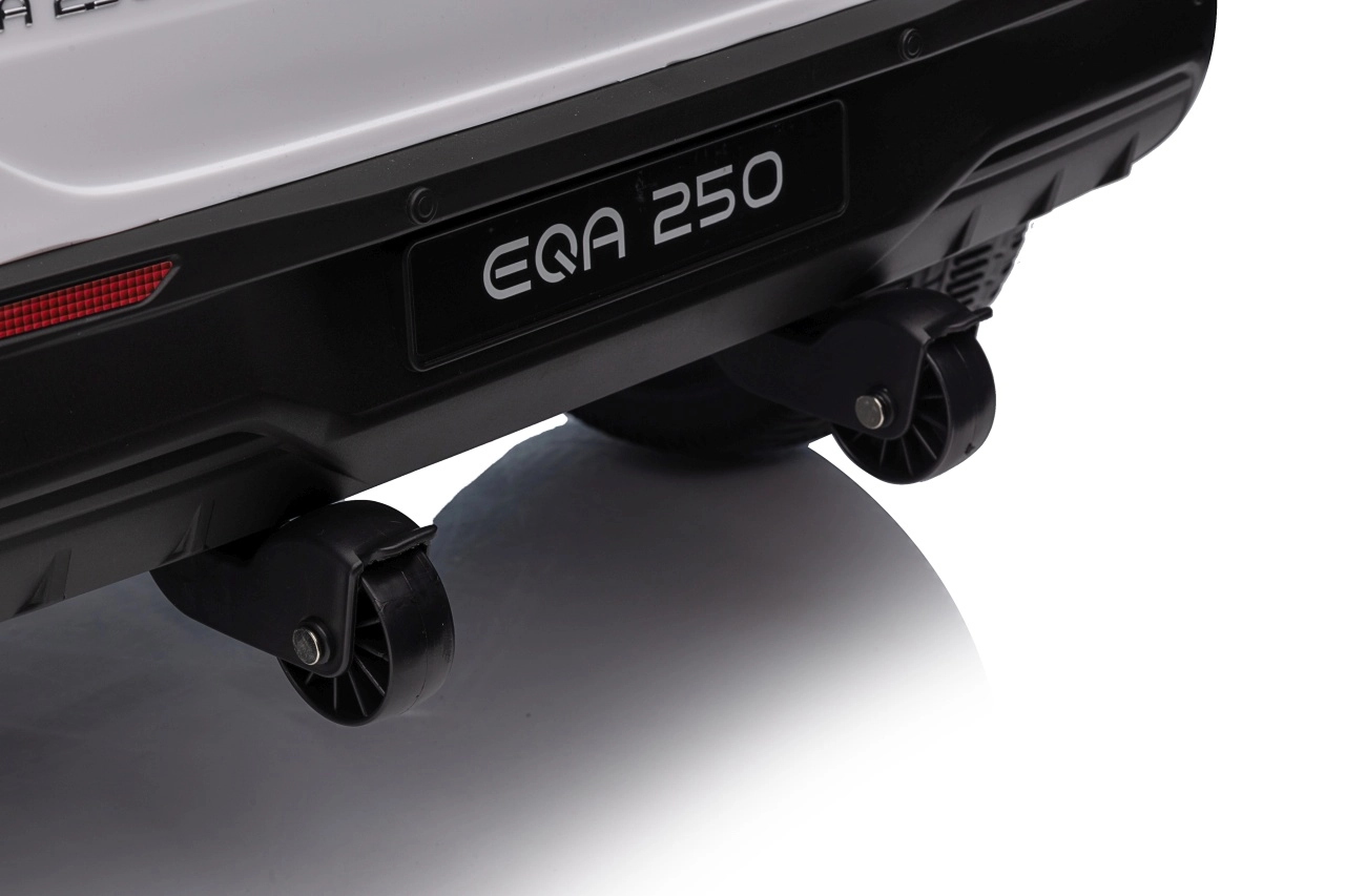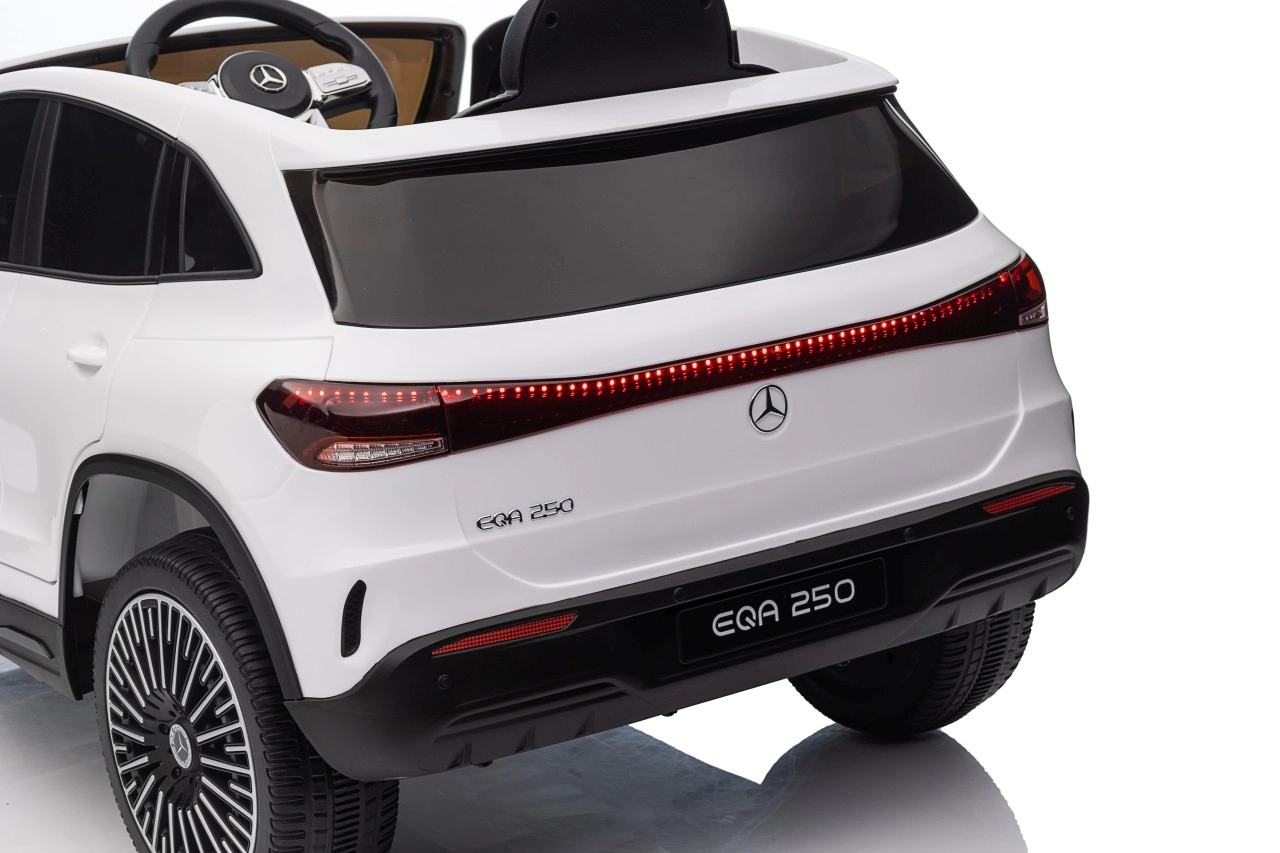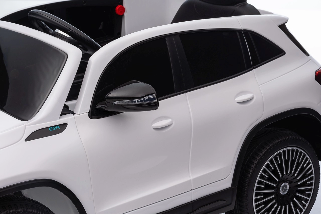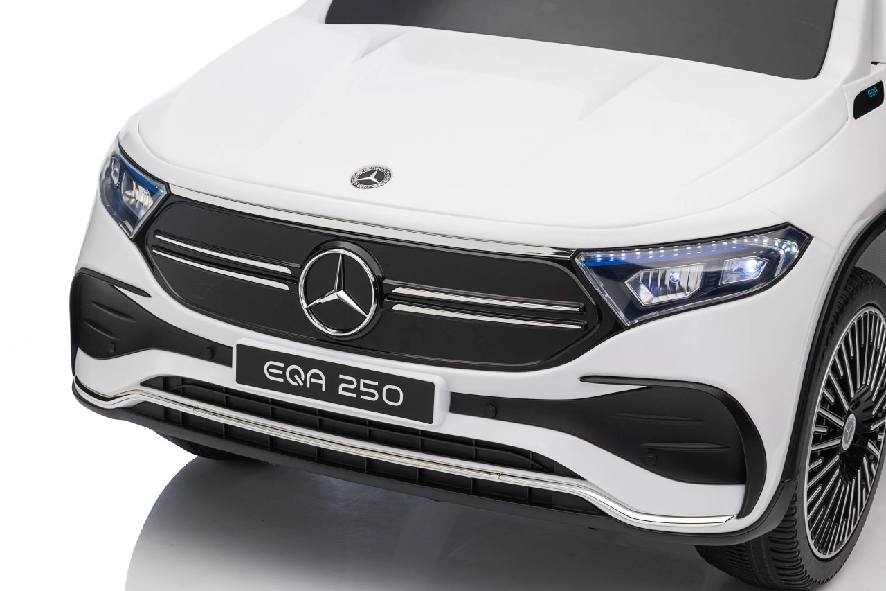 Elektryczny samochodzik MERCEDES-BENZ EQA 250 w białym kolorze łączy premium design z praktycznymi funkcjami. Dzięki czterem silnikom 35 W zapewnia płynną jazdę, a miękkie koła EVA i tylne amortyzatory zwiększają komfort na nierównościach. Płynny start bez szarpania oraz wybór 2 prędkości do przodu/tyłu ułatwiają prowadzenie młodszym kierowcom.
