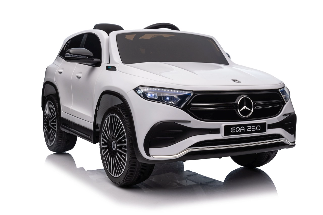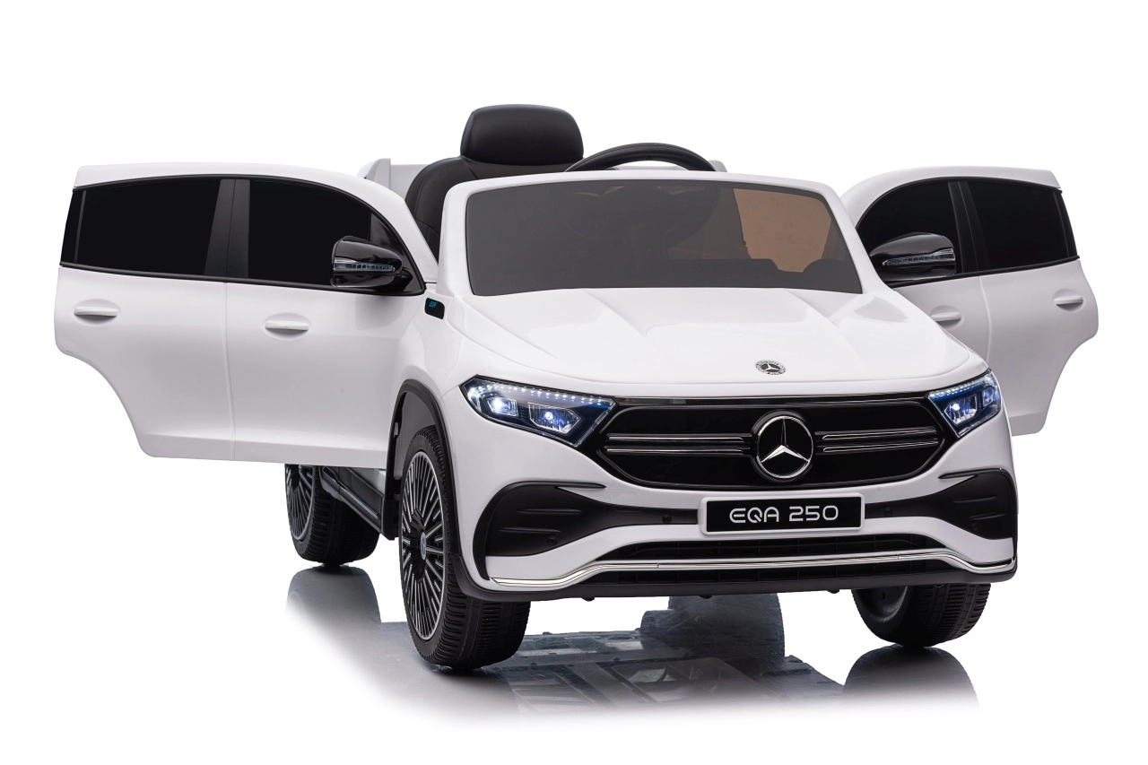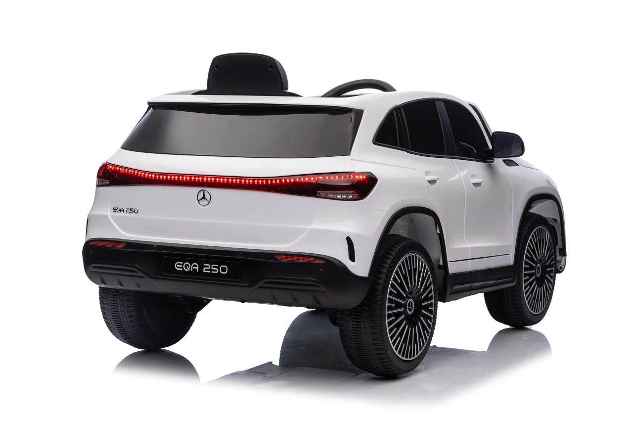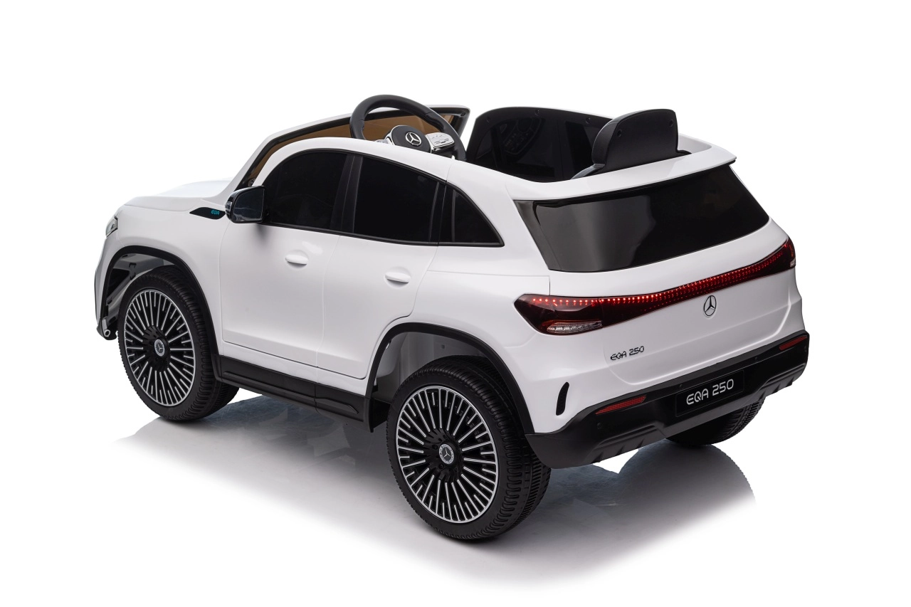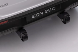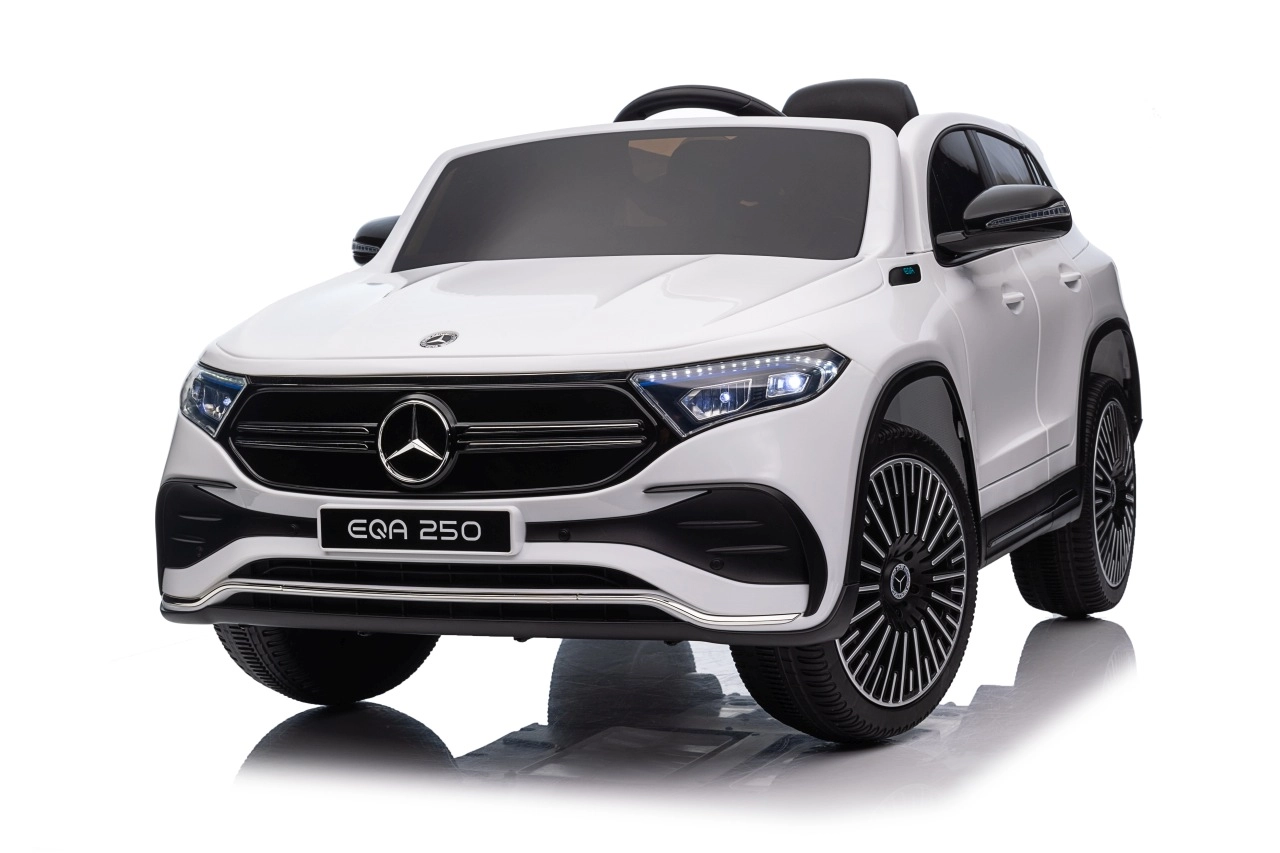 Elektryczny samochodzik MERCEDES-BENZ EQA 250 w białym kolorze łączy premium design z praktycznymi funkcjami. Dzięki czterem silnikom 35 W zapewnia płynną jazdę, a miękkie koła EVA i tylne amortyzatory zwiększają komfort na nierównościach. Płynny start bez szarpania oraz wybór 2 prędkości do przodu/tyłu ułatwiają prowadzenie młodszym kierowcom.
