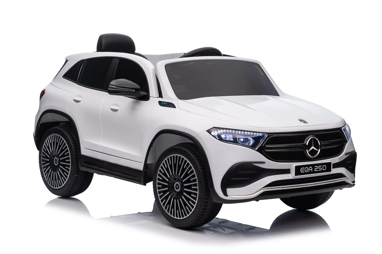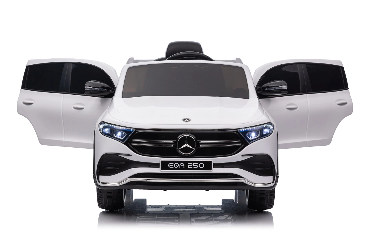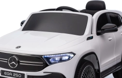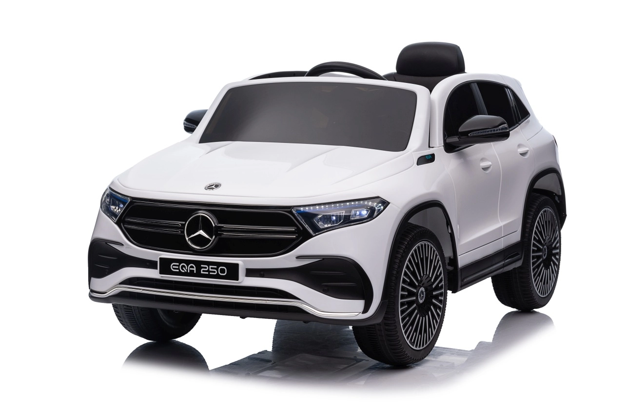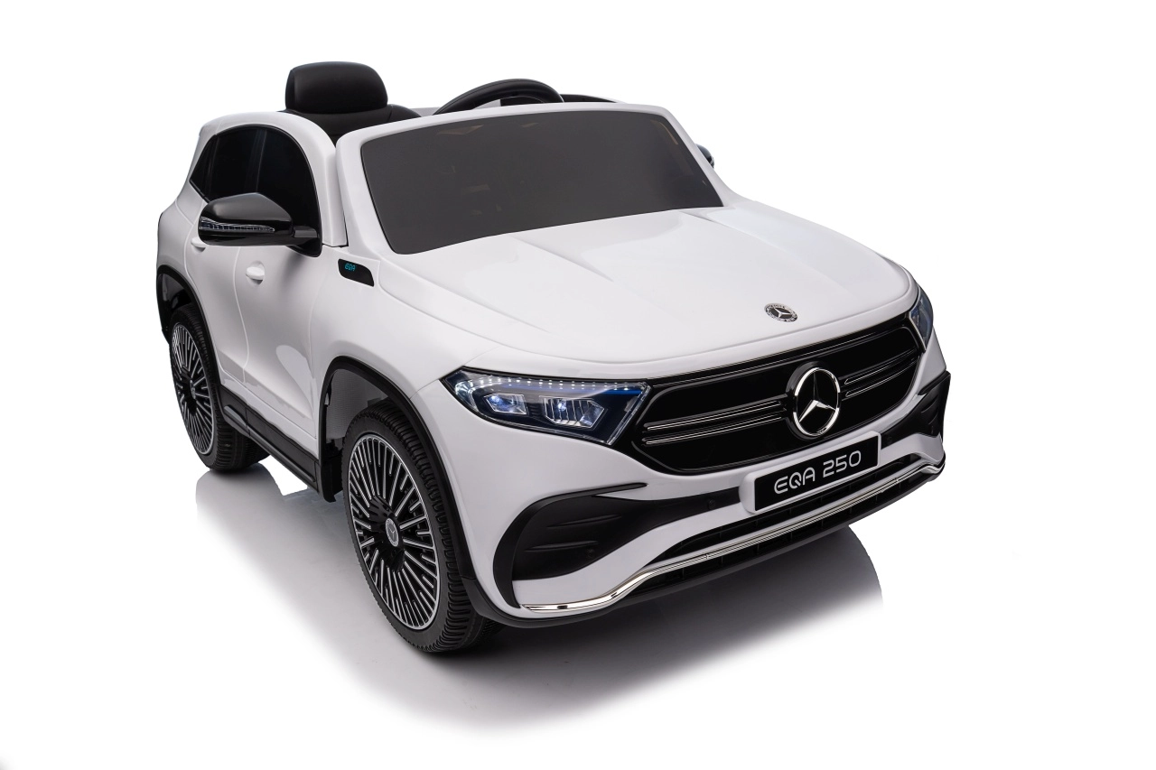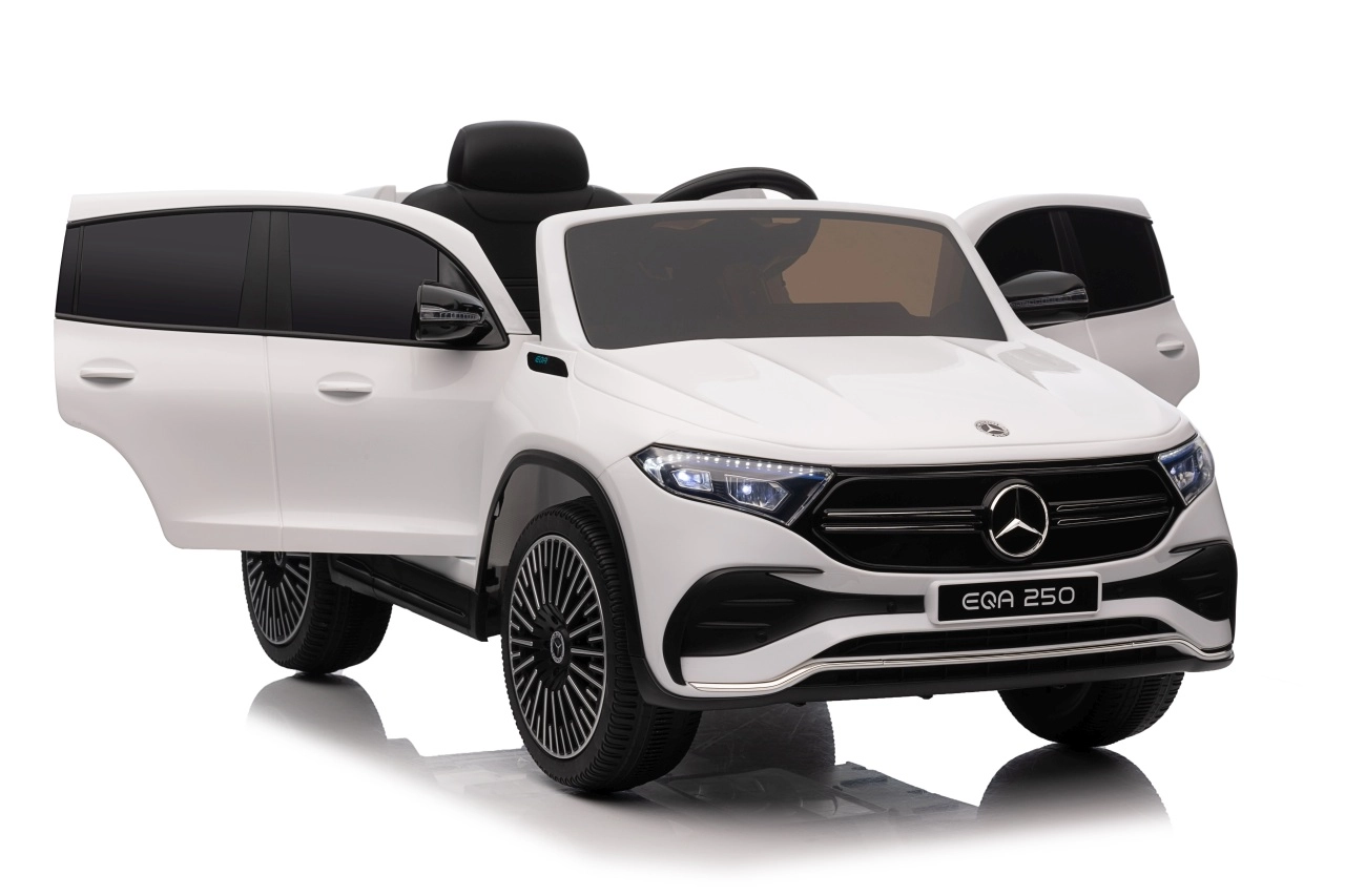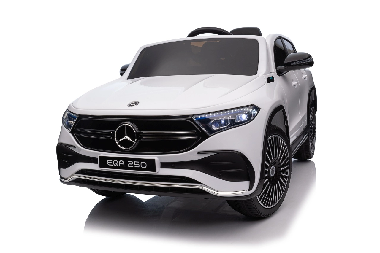 Elektryczny samochodzik MERCEDES-BENZ EQA 250 w białym kolorze łączy premium design z praktycznymi funkcjami. Dzięki czterem silnikom 35 W zapewnia płynną jazdę, a miękkie koła EVA i tylne amortyzatory zwiększają komfort na nierównościach. Płynny start bez szarpania oraz wybór 2 prędkości do przodu/tyłu ułatwiają prowadzenie młodszym kierowcom.
