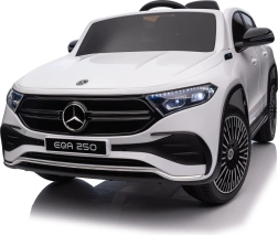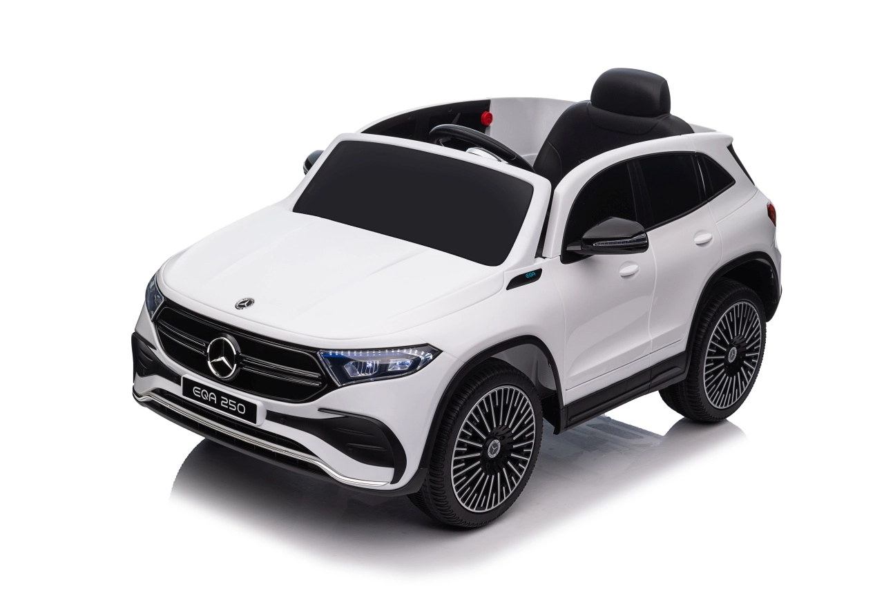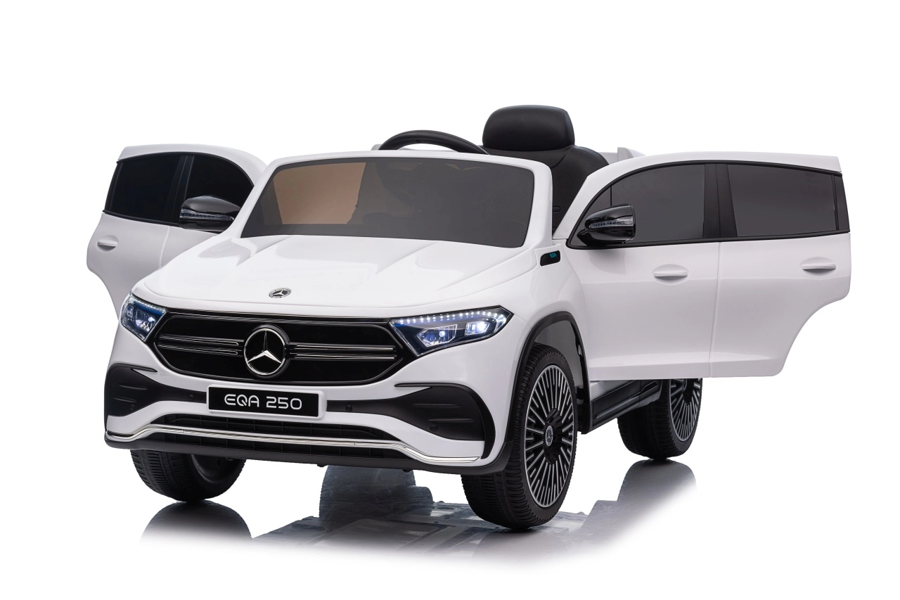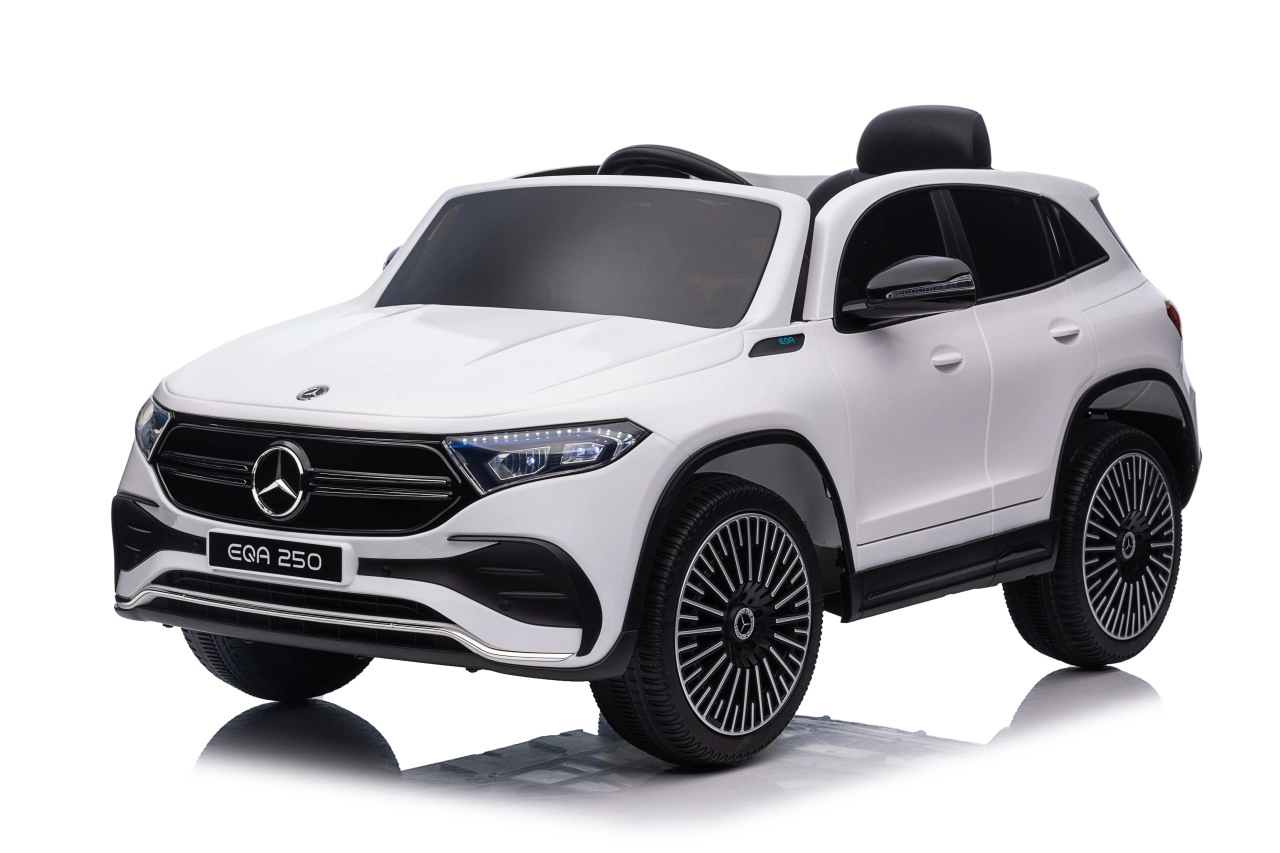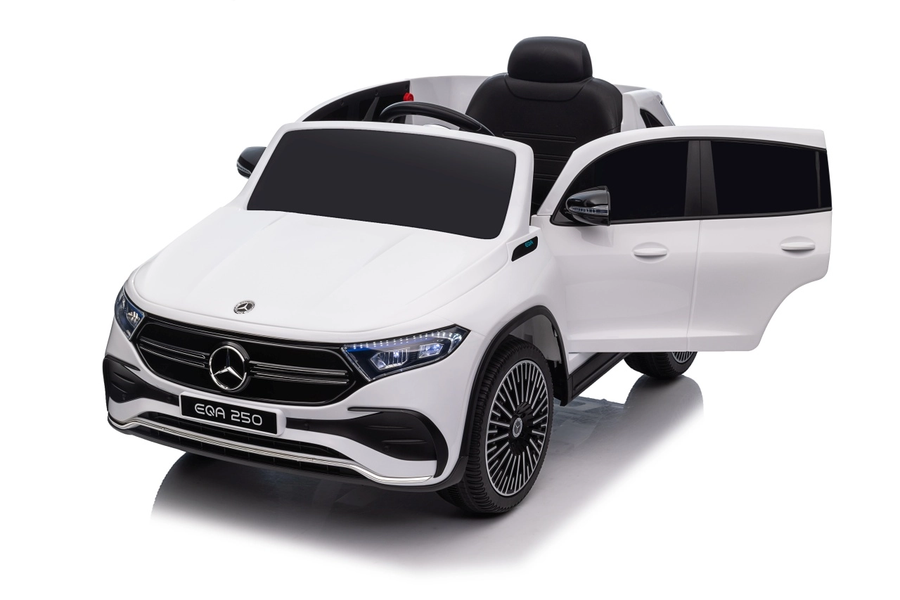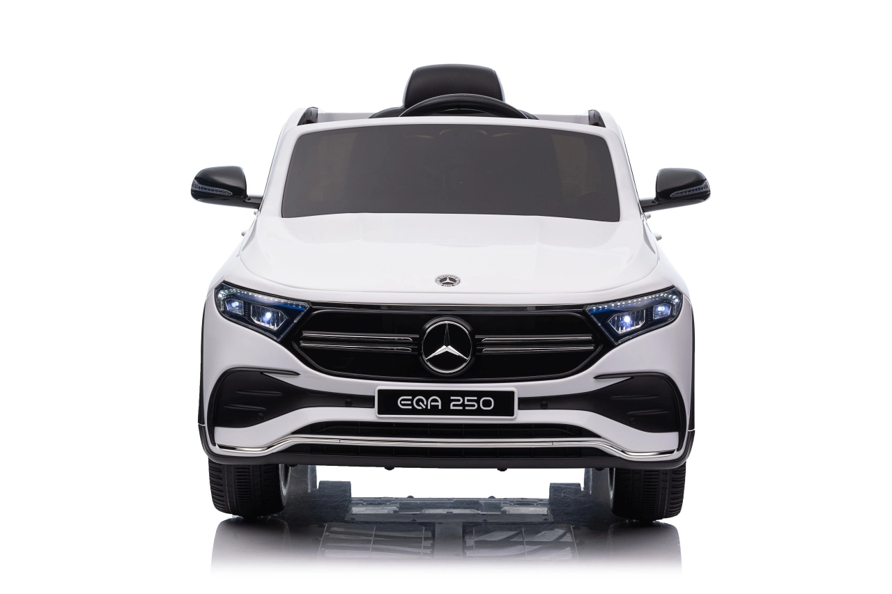 Elektryczny samochodzik MERCEDES-BENZ EQA 250 w białym kolorze łączy premium design z praktycznymi funkcjami. Dzięki czterem silnikom 35 W zapewnia płynną jazdę, a miękkie koła EVA i tylne amortyzatory zwiększają komfort na nierównościach. Płynny start bez szarpania oraz wybór 2 prędkości do przodu/tyłu ułatwiają prowadzenie młodszym kierowcom.