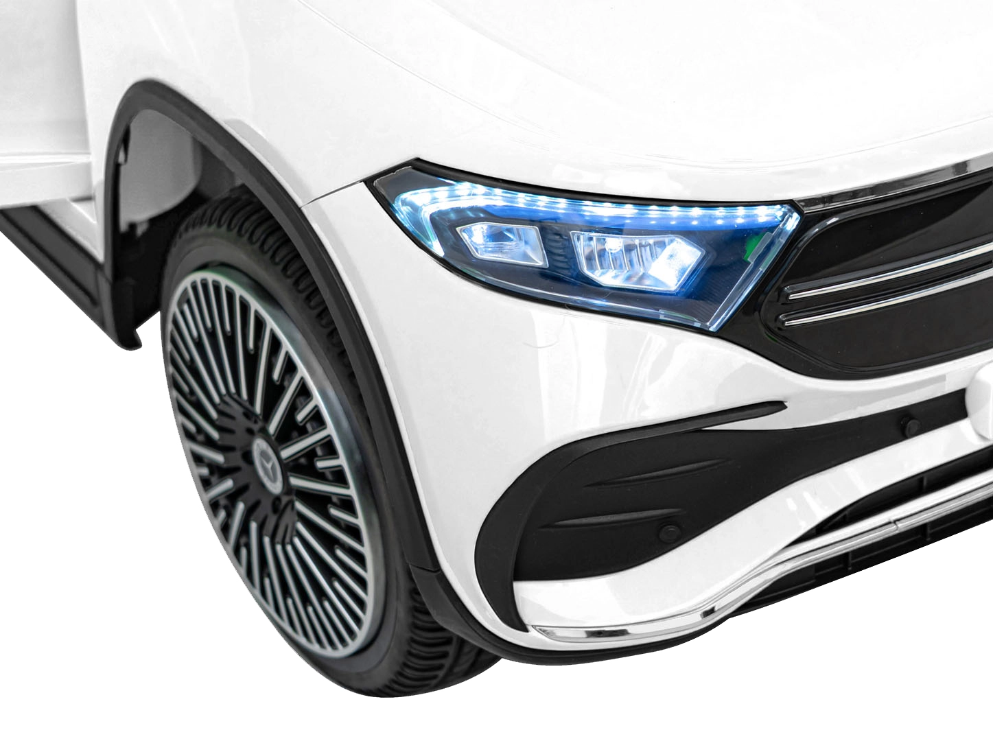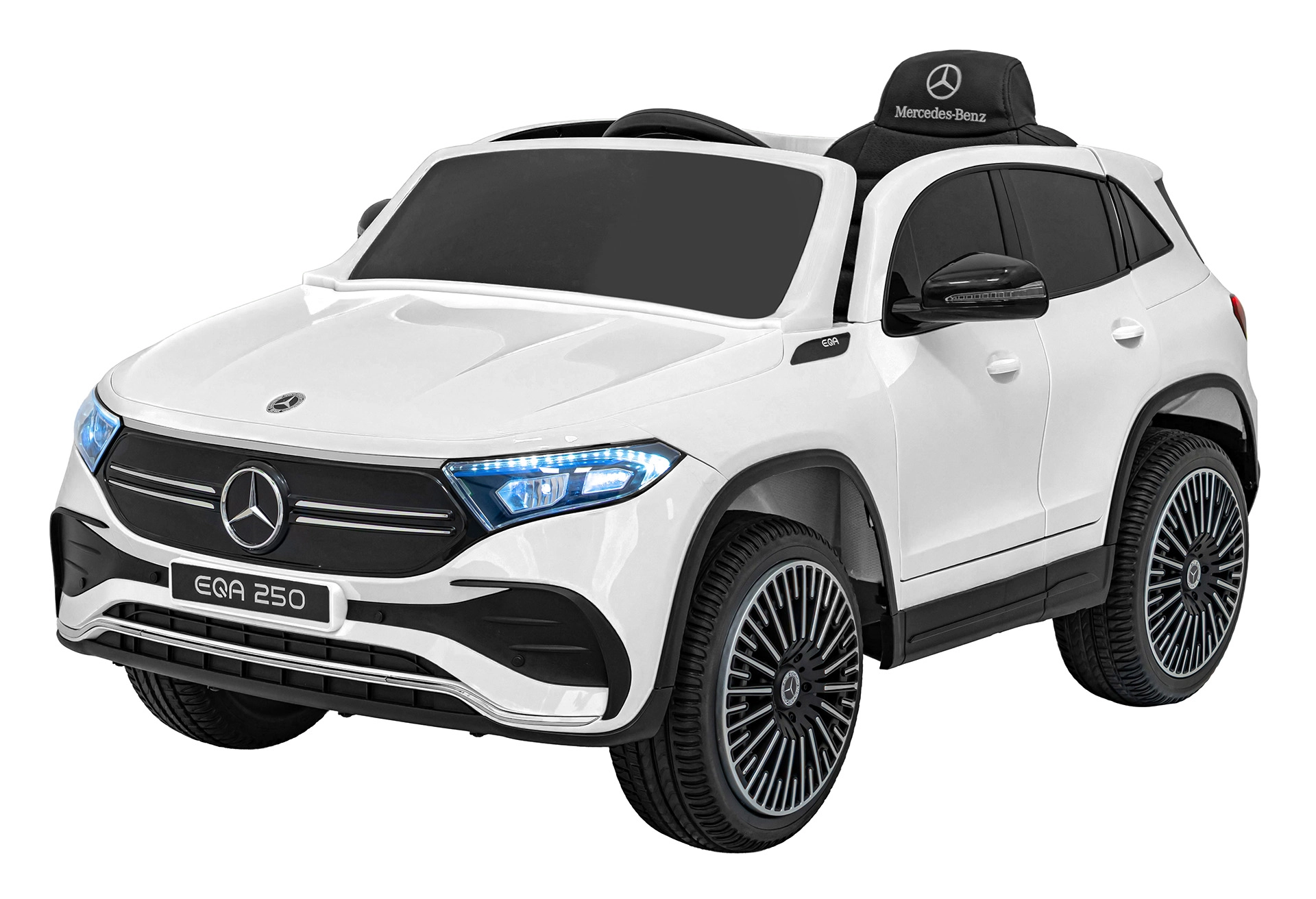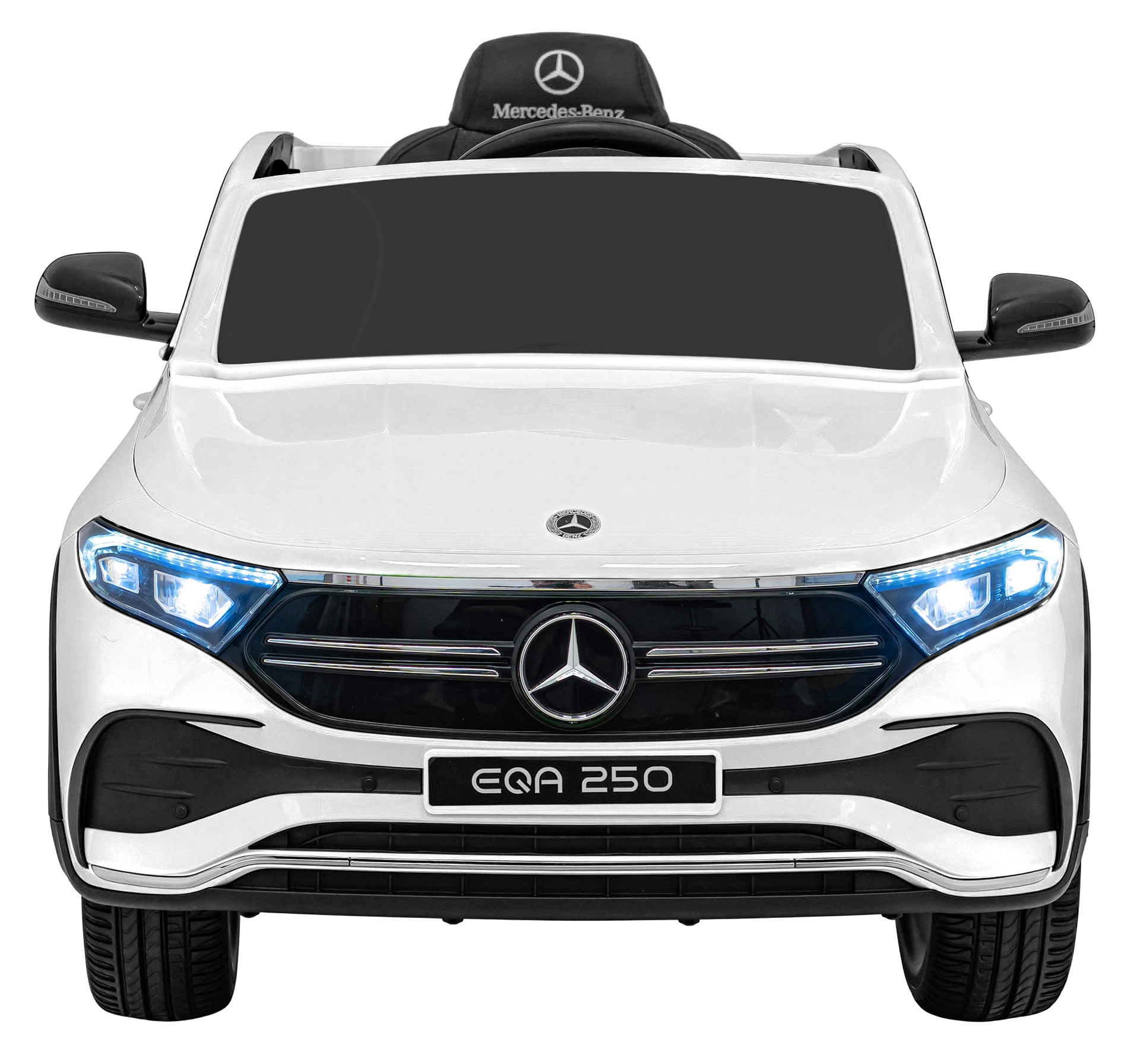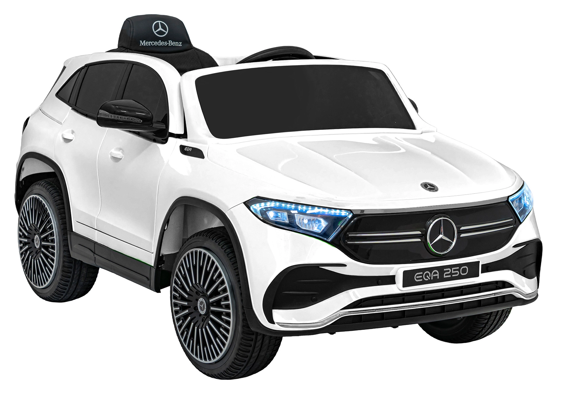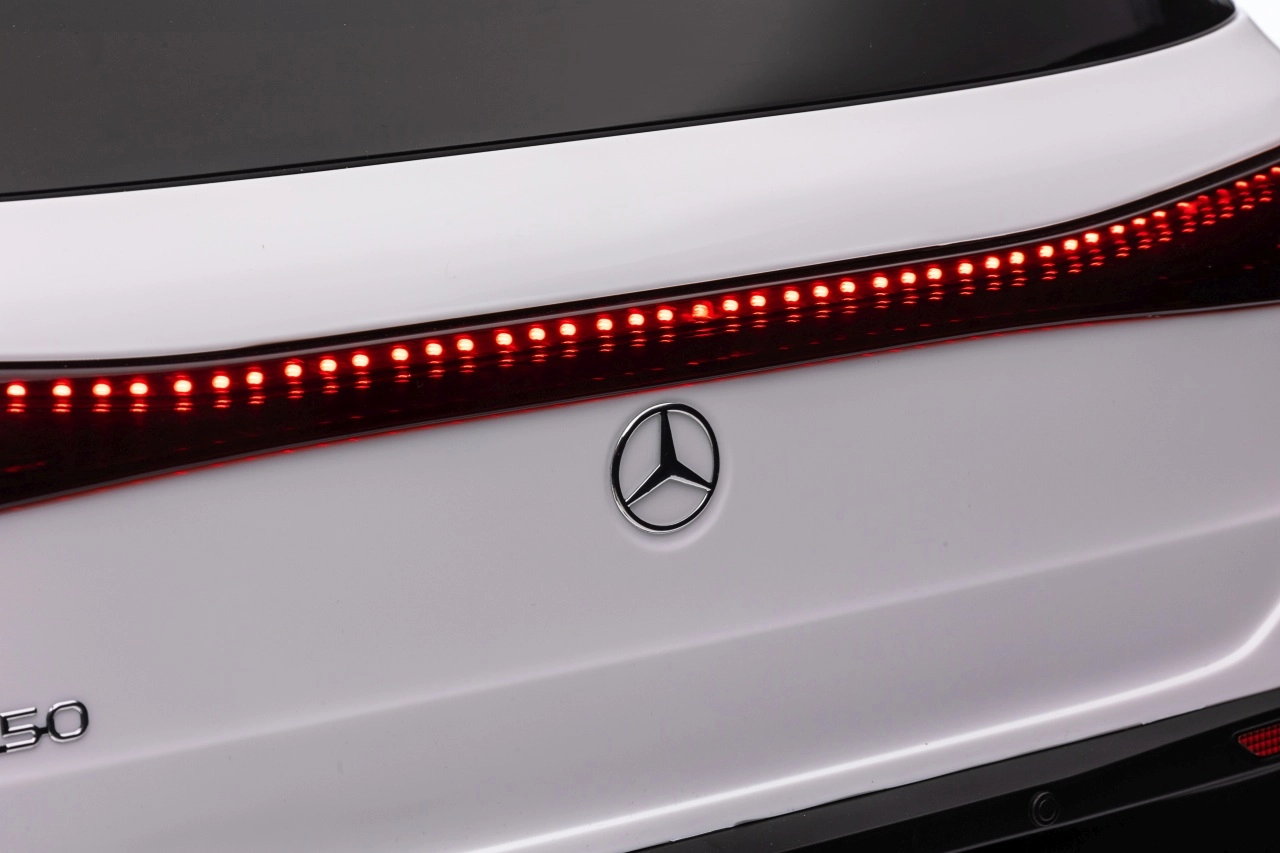 Elektryczny samochodzik MERCEDES-BENZ EQA 250 w białym kolorze łączy premium design z praktycznymi funkcjami. Dzięki czterem silnikom 35 W zapewnia płynną jazdę, a miękkie koła EVA i tylne amortyzatory zwiększają komfort na nierównościach. Płynny start bez szarpania oraz wybór 2 prędkości do przodu/tyłu ułatwiają prowadzenie młodszym kierowcom.