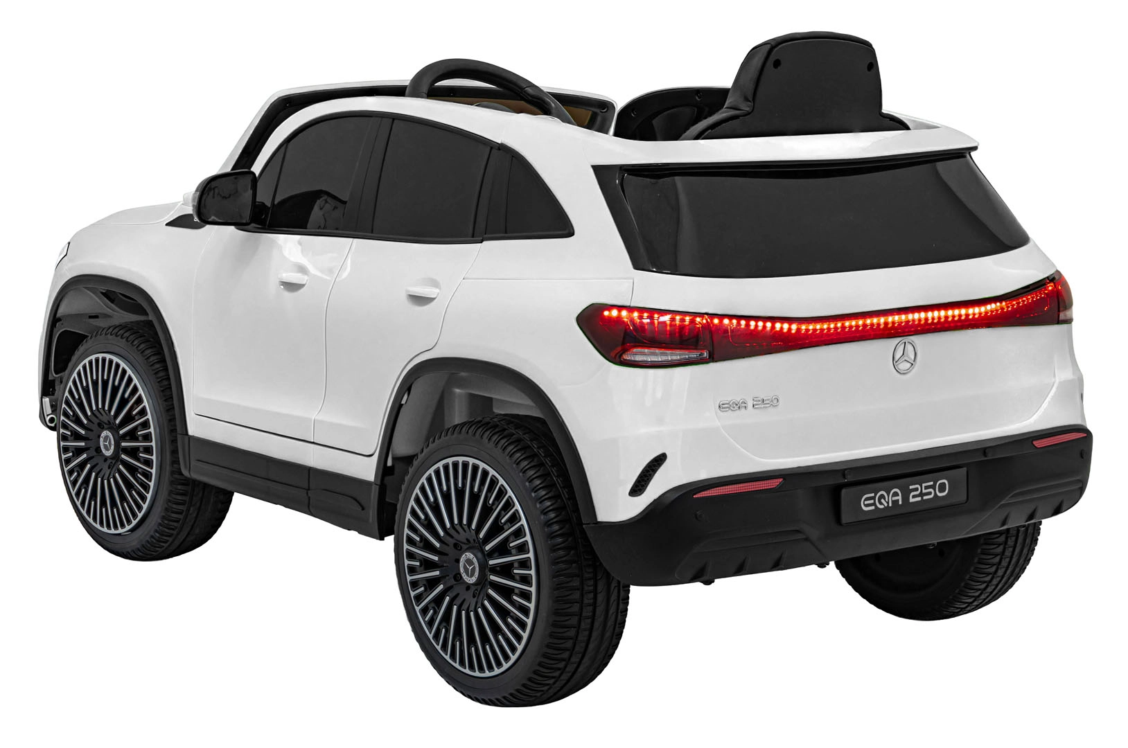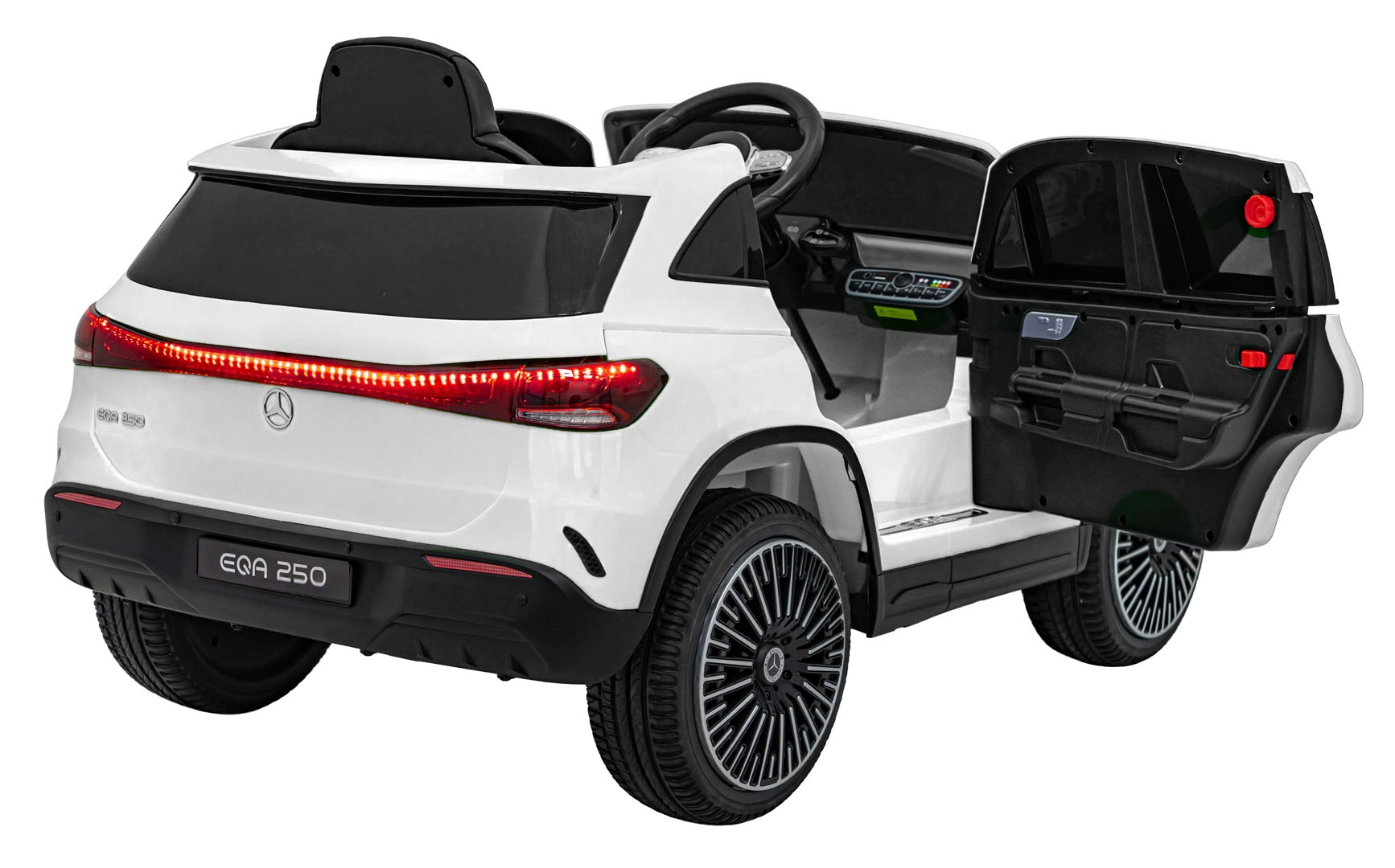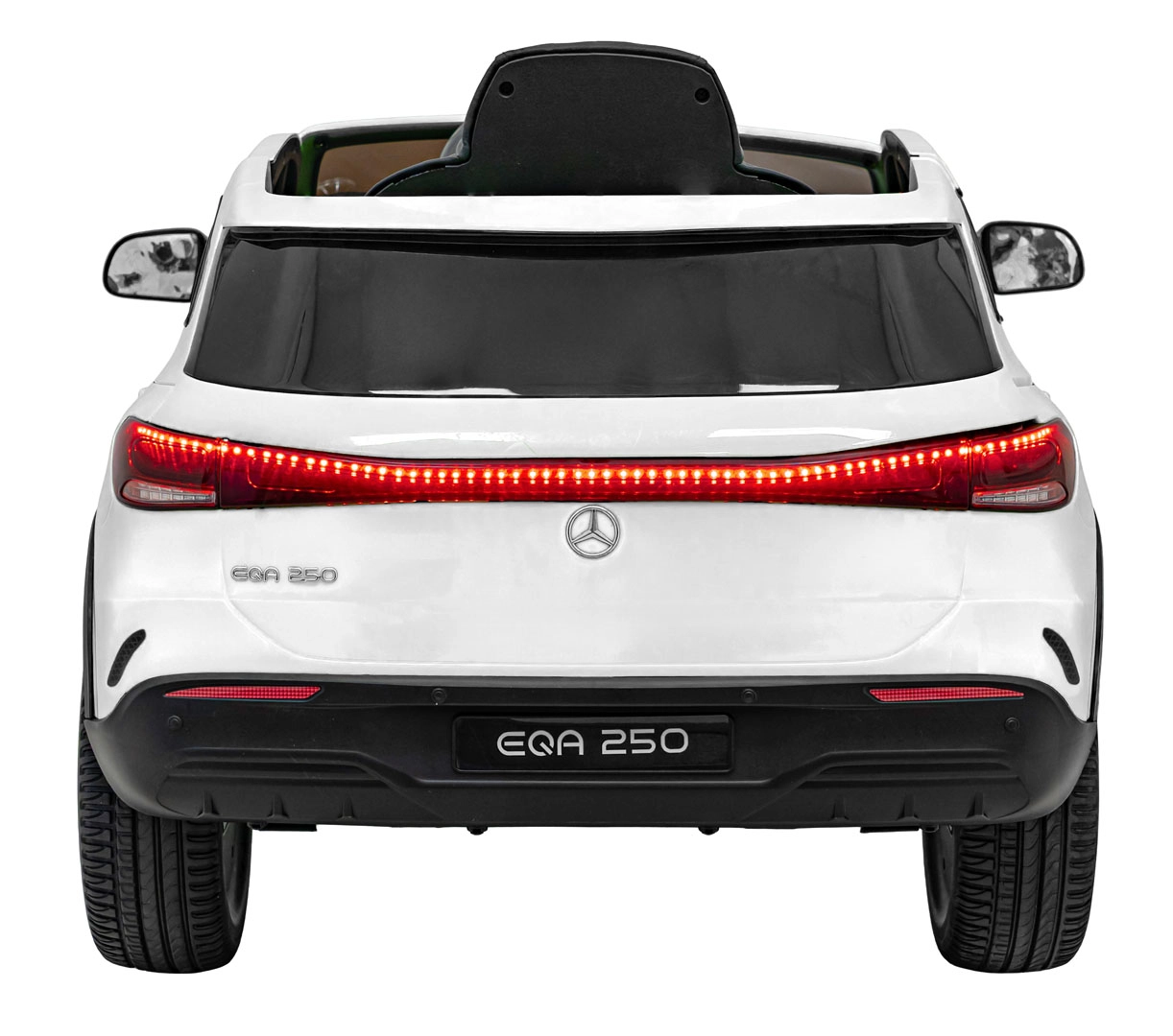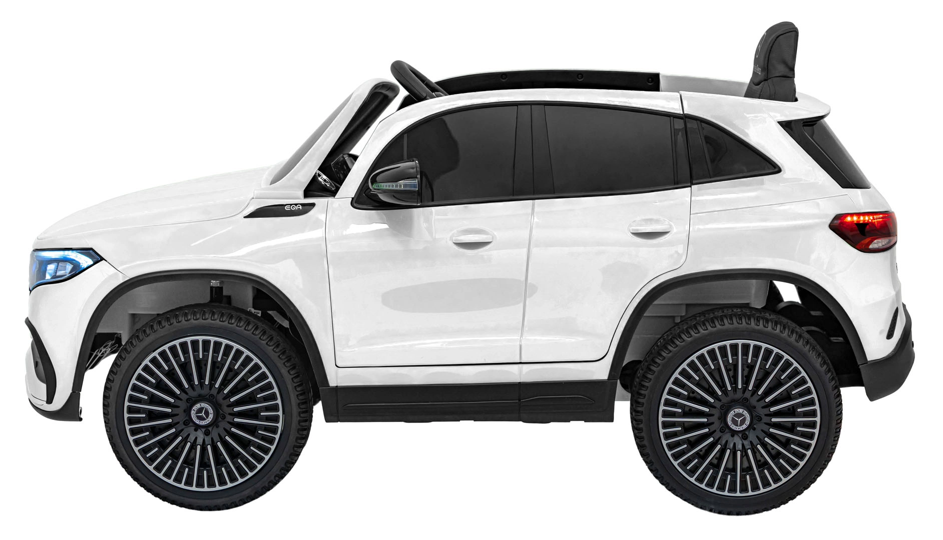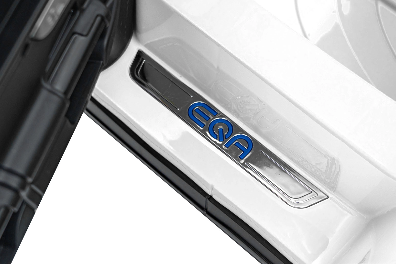 Elektryczny samochodzik MERCEDES-BENZ EQA 250 w białym kolorze łączy premium design z praktycznymi funkcjami. Dzięki czterem silnikom 35 W zapewnia płynną jazdę, a miękkie koła EVA i tylne amortyzatory zwiększają komfort na nierównościach. Płynny start bez szarpania oraz wybór 2 prędkości do przodu/tyłu ułatwiają prowadzenie młodszym kierowcom.