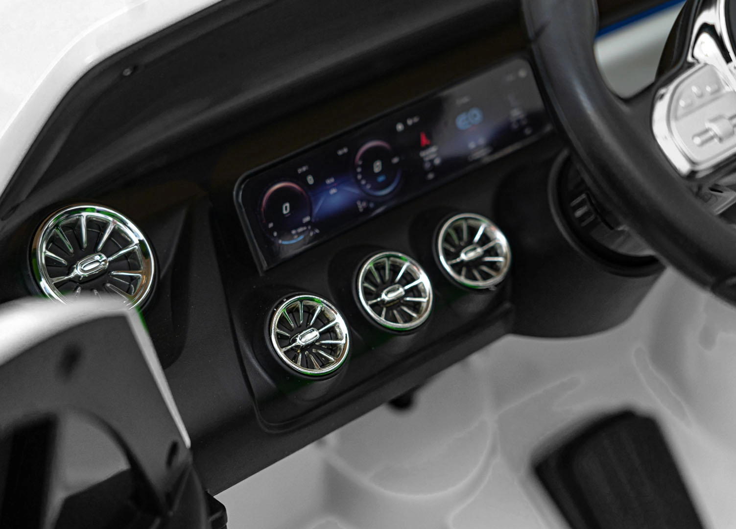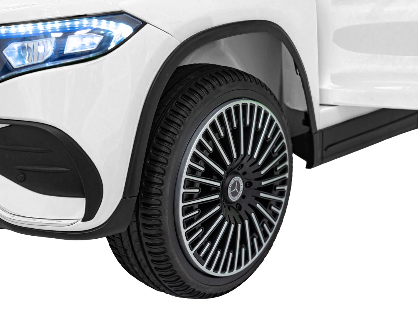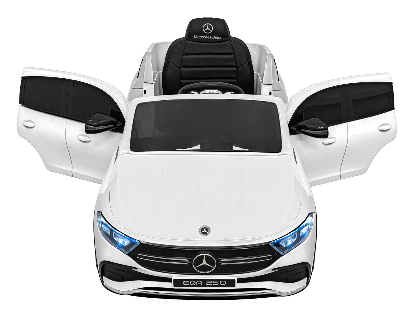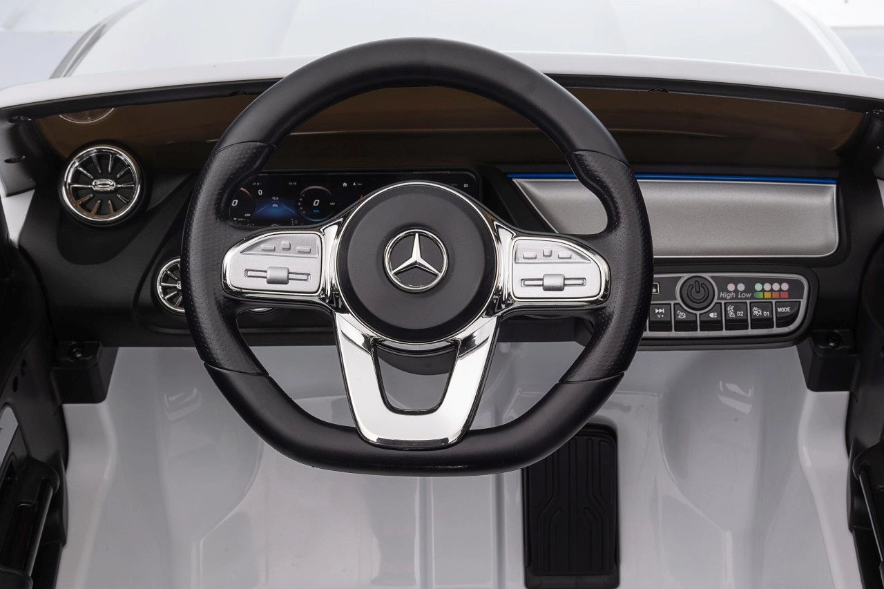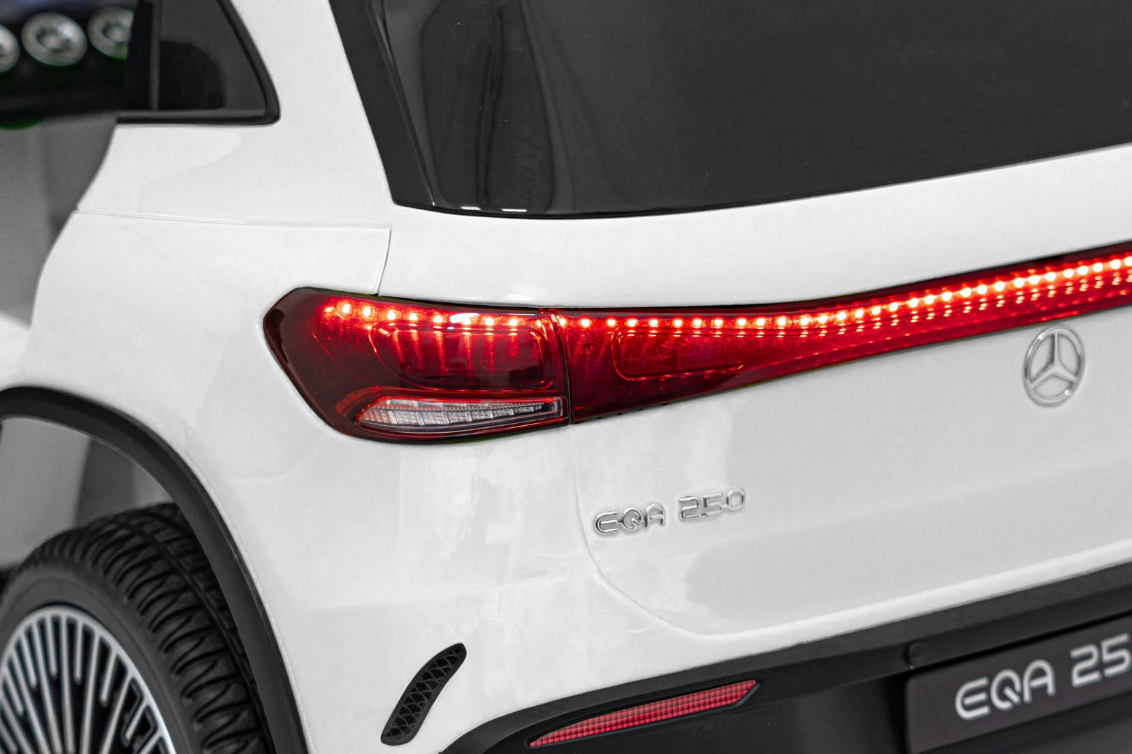 Elektryczny samochodzik MERCEDES-BENZ EQA 250 w białym kolorze łączy premium design z praktycznymi funkcjami. Dzięki czterem silnikom 35 W zapewnia płynną jazdę, a miękkie koła EVA i tylne amortyzatory zwiększają komfort na nierównościach. Płynny start bez szarpania oraz wybór 2 prędkości do przodu/tyłu ułatwiają prowadzenie młodszym kierowcom.