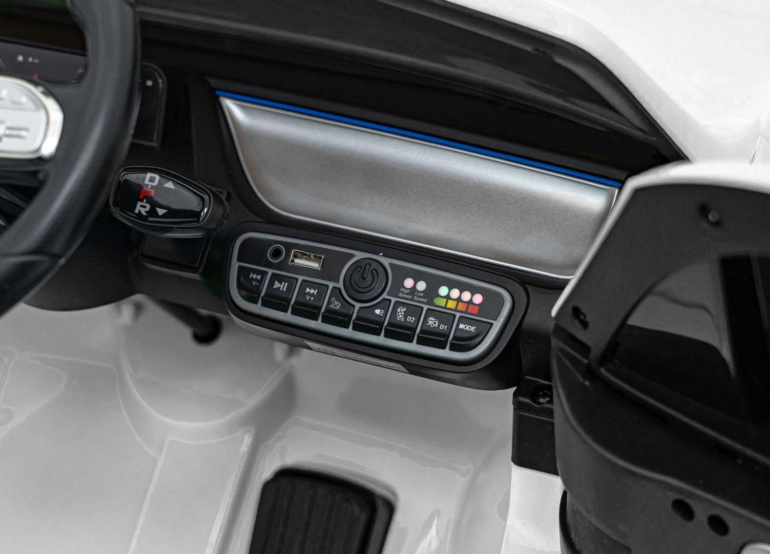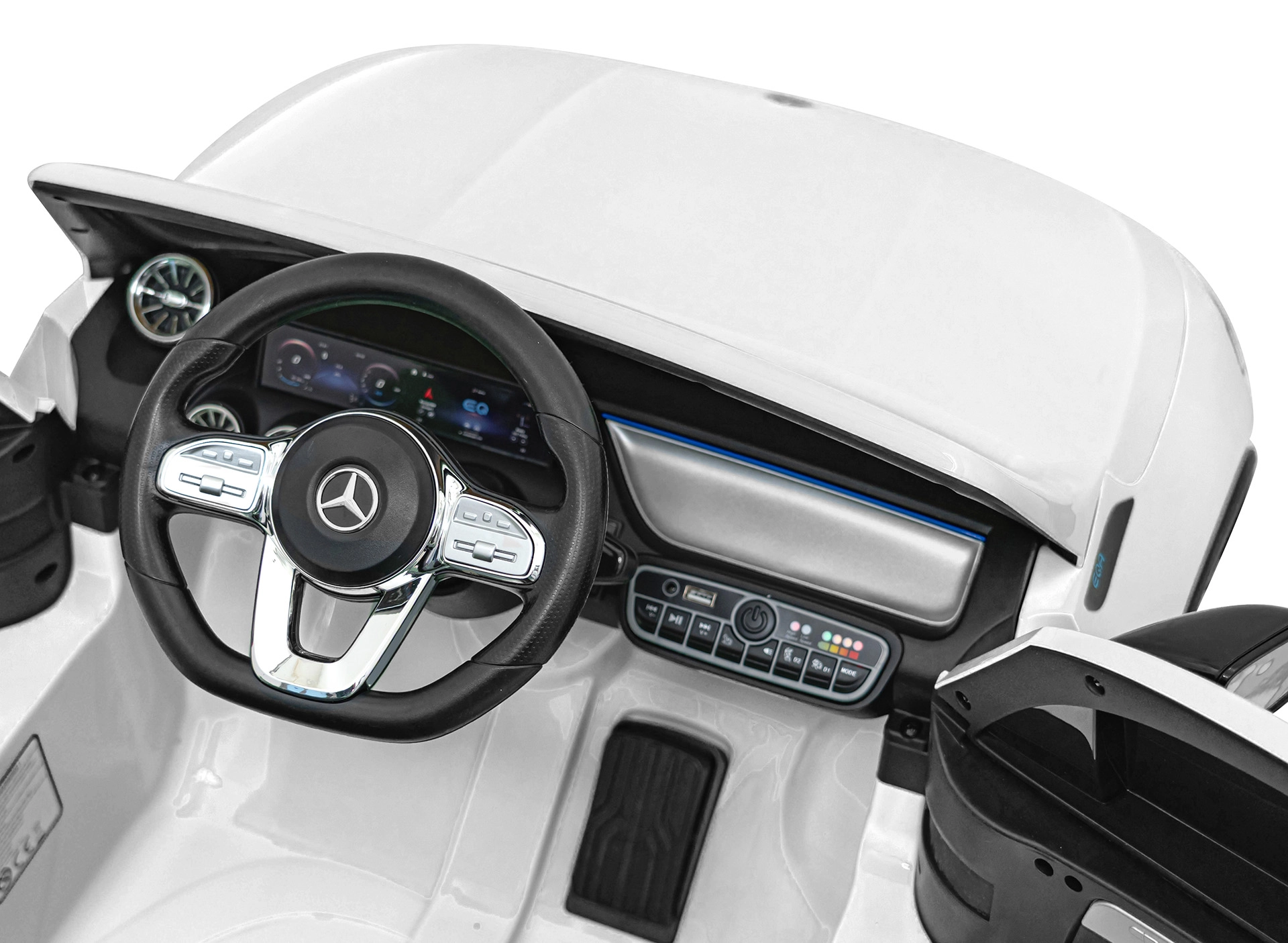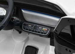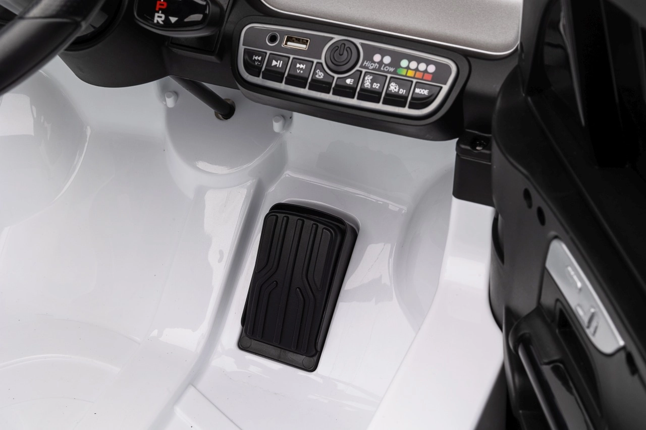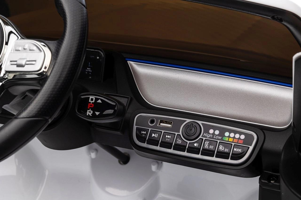 Panel multimedialny oferuje Bluetooth, USB, MP3/AUX, wgrane melodie oraz przyciski klaksonu na kierownicy. Wbudowany wskaźnik naładowania pozwala kontrolować energię. Otwierane drzwi ułatwiają wsiadanie i potęgują autentyczne wrażenia z jazdy.
