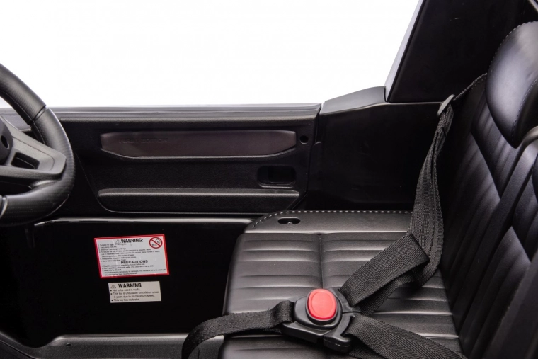 Siedzisko z eko skóry z pasami bezpieczeństwa pewnie trzyma małego kierowcę na miejscu. Otwierane drzwi ułatwiają wsiadanie i wysiadanie.