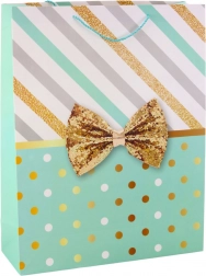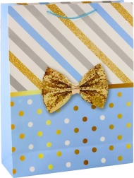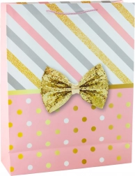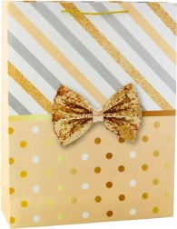 Duża torba prezentowa z unikalnym designem pasków i kropek w złotym kolorze, uzupełniona ozdobną kokardą.