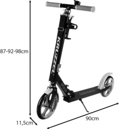 Lekka miejska hulajnoga KRUZZEL z mechanizmem składania i dużymi kołami 200 mm oferuje płynną i stabilną jazdę po chodnikach i nierównościach. Dzięki 3-stopniowej regulacji kierownicy (87–92–98 cm) rośnie wraz z dzieckiem, antypoślizgowy podest i gripy zapewniają bezpieczeństwo, a hamulec nożny umożliwia szybkie zatrzymanie. W zestawie znajduje się boczna nóżka, pasek do przenoszenia, uchwyt na bidon, dzwonek i inne akcesoria – idealna na prezent.
