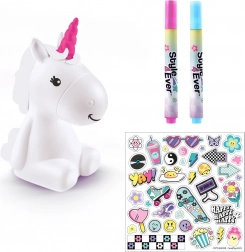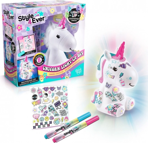 Wprowadź odrobinę magii do pokoju dziecka dzięki zestawowi kreatywnemu Style4Ever świecący jednorożec, który dzieci ozdobią samodzielnie. Po ukończeniu jednorożec rozświetli się 8 kolorami i stworzy przytulną atmosferę. W zestawie znajduje się świecąca figurka, 4 flamastry, naklejki oraz łatwa instrukcja, a baterie są dołączone. Odpowiednie od 6 lat.