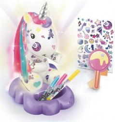 W zestawie znajduje się świecąca figurka jednorożca na podstawce, 4 kolorowe flamastry do malowania i ozdabiania, naklejki oraz doczepiane, kolorowe pasemka włosów dla niepowtarzalnego wyglądu. Lampka świeci 8 kolorami, więc łatwo stworzyć przytulną atmosferę do czytania, zasypiania i zabawy. Dzięki prostym instrukcjom tworzenie jest łatwe i przyjemne.