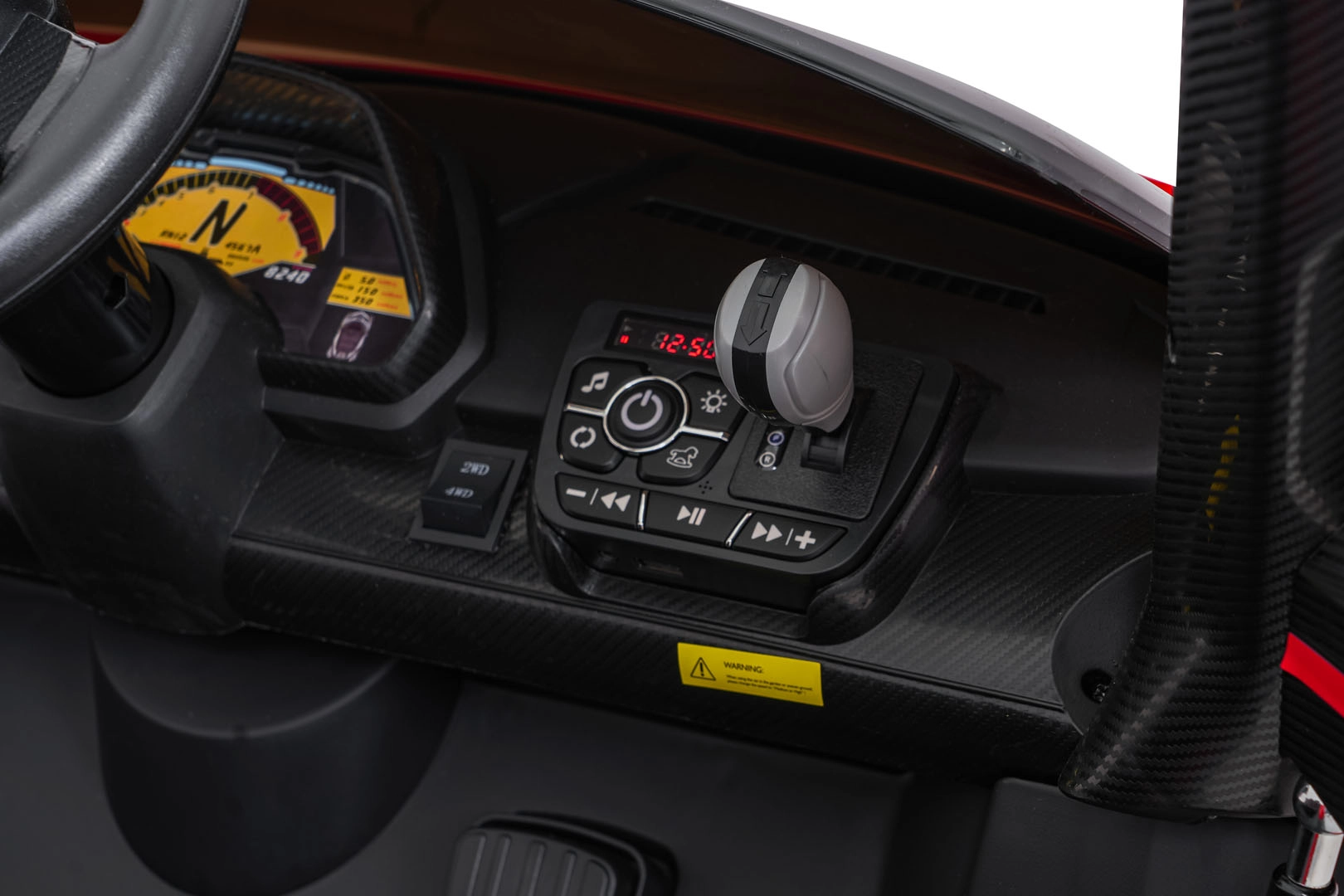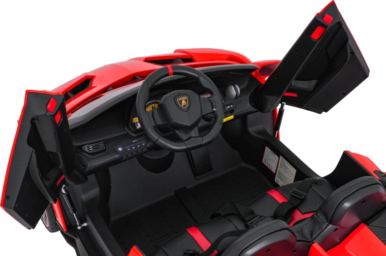 Realistyczny design podkreślają otwierane nożycowe drzwi, funkcjonalne światła LED, sportowe detale i dwuosobowe siedzenie z eko skóry z pasami bezpieczeństwa. Sterowanie jest intuicyjne z kokpitu (kierownica, pedał), a pojazd można też w pełni prowadzić pilotem rodzicielskim 2,4 GHz z przyciskiem STOP do natychmiastowego zatrzymania.