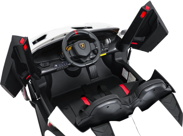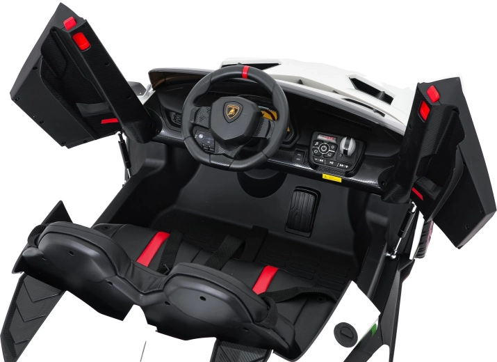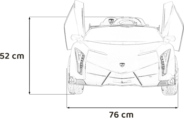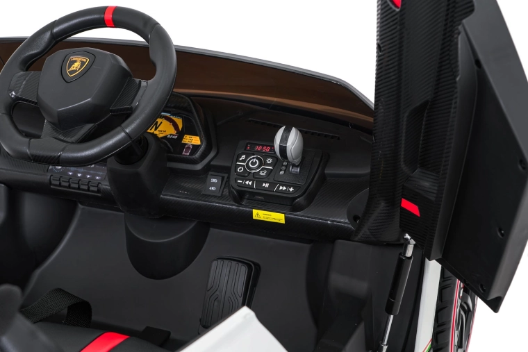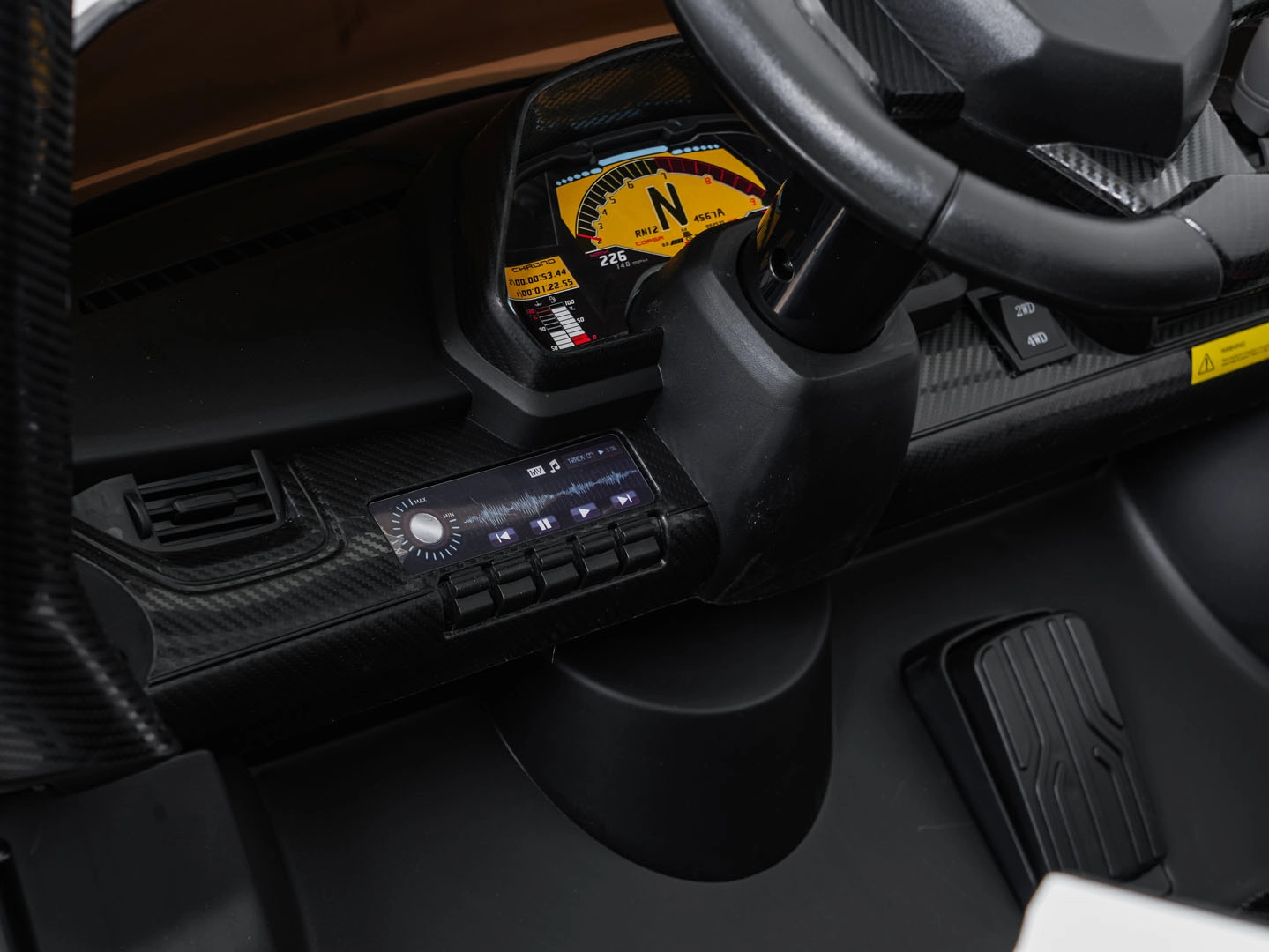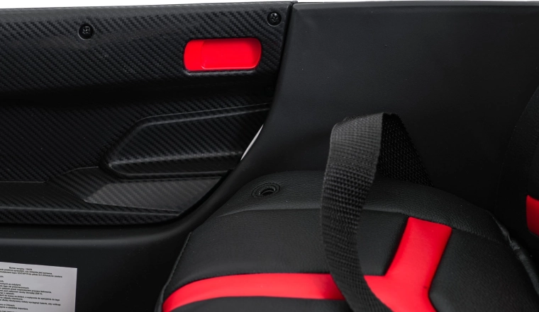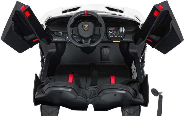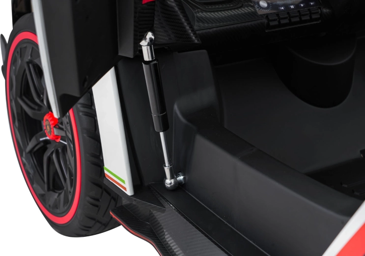 Realistyczny design podkreślają otwierane nożycowe drzwi, funkcjonalne światła LED, sportowe detale i dwuosobowe siedzenie z eko skóry z pasami bezpieczeństwa. Sterowanie jest intuicyjne z kokpitu (kierownica, pedał), a pojazd można też w pełni prowadzić pilotem rodzicielskim 2,4 GHz z przyciskiem STOP do natychmiastowego zatrzymania.