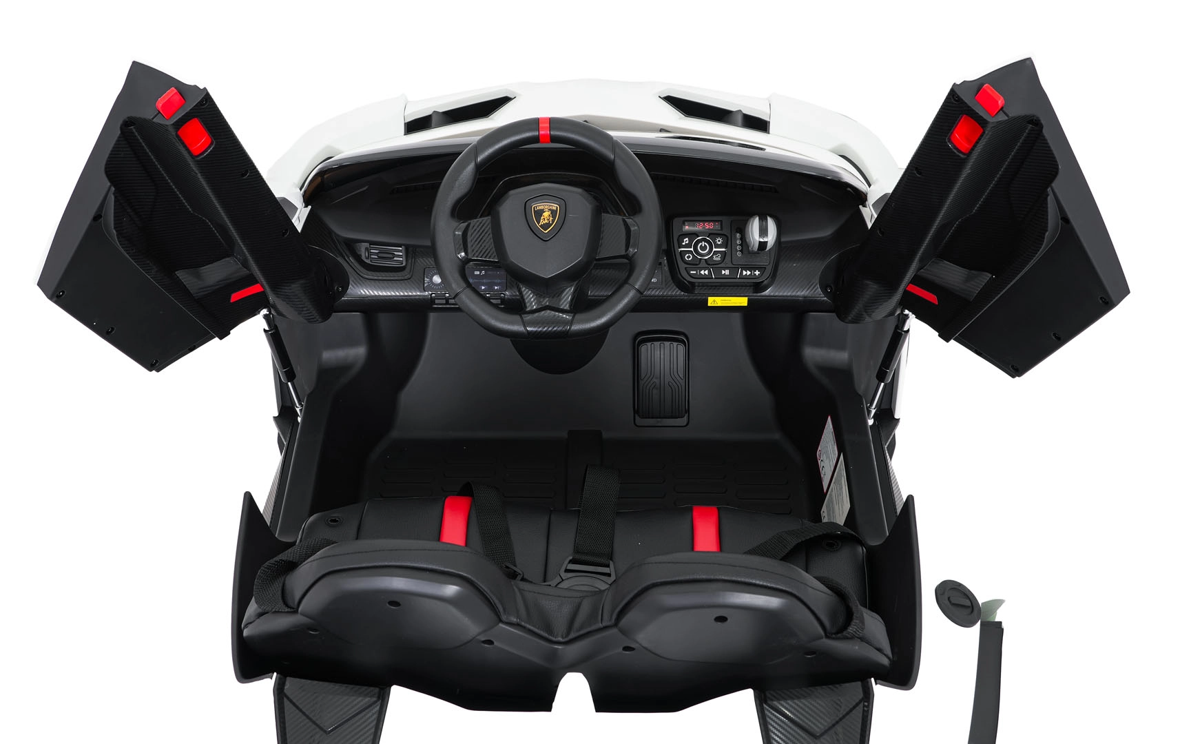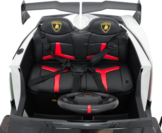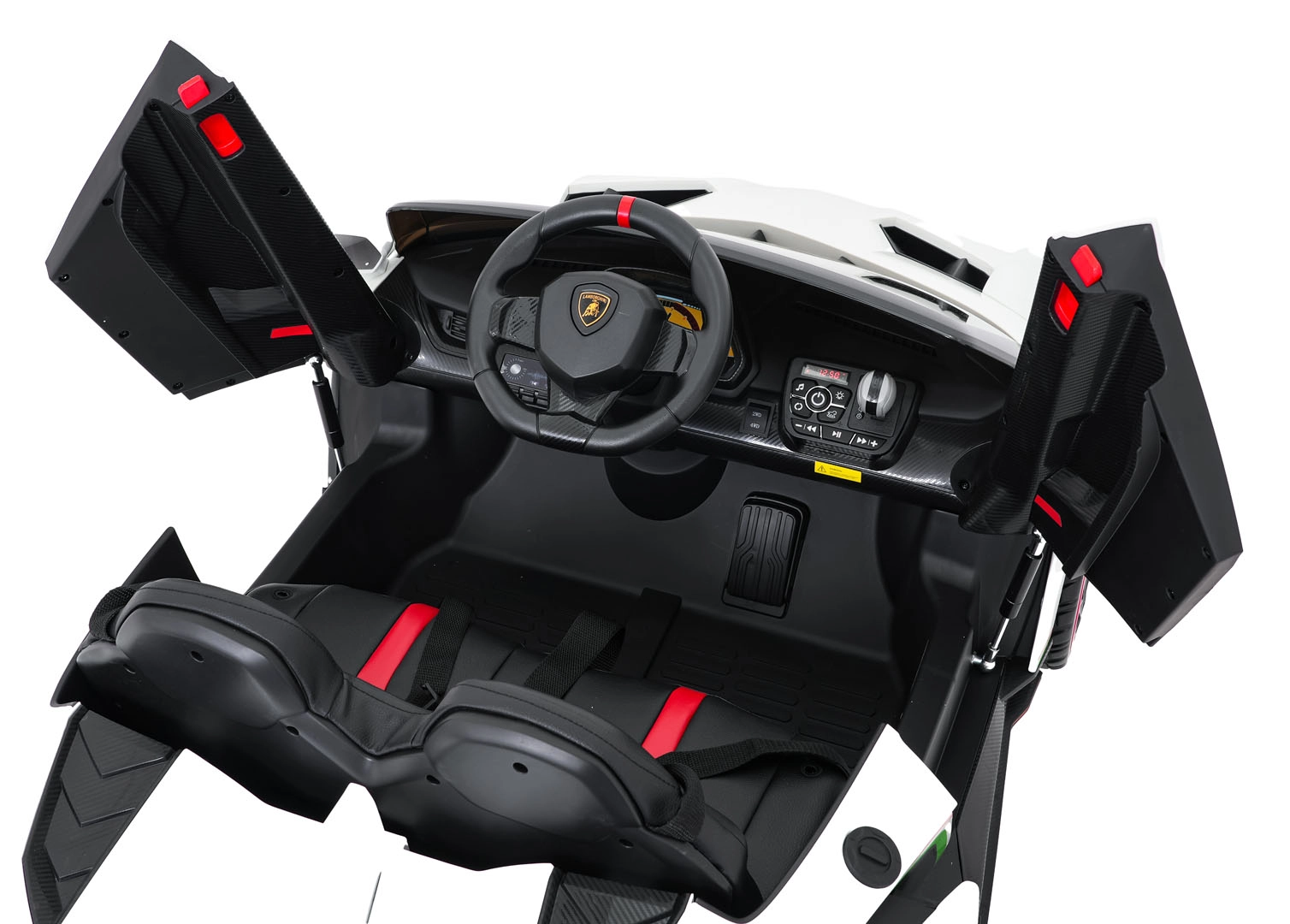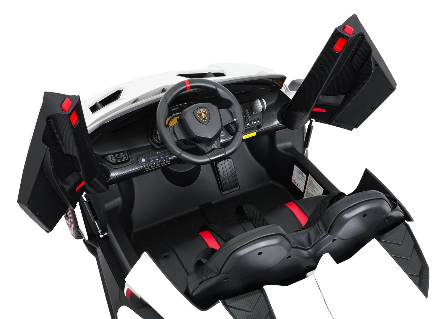 Realistyczny design podkreślają otwierane nożycowe drzwi, funkcjonalne światła LED, sportowe detale i dwuosobowe siedzenie z eko skóry z pasami bezpieczeństwa. Sterowanie jest intuicyjne z kokpitu (kierownica, pedał), a pojazd można też w pełni prowadzić pilotem rodzicielskim 2,4 GHz z przyciskiem STOP do natychmiastowego zatrzymania.
