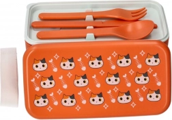 pomarańczowy lunch box z kotkiem z łyżką i widelcem