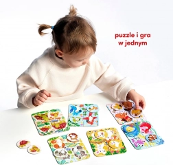 Odkryj zabawne puzzle dla dzieci, które są jednocześnie pierwszą prostą grą. W opakowaniu znajdziesz 6 czteroelementowych układanek ze zwierzątkami oraz 12 okrągłych żetonów do dopasowywania. Idealne do rozwoju motoryki małej, percepcji i cierpliwości – a potem hop do pierwszej gry planszowej z waszych gotowych obrazków!